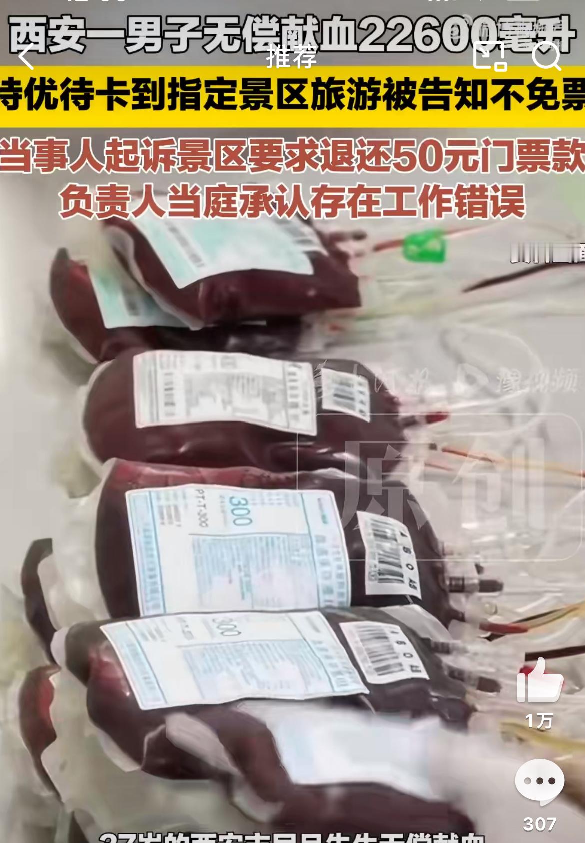 男子献血2.2万毫升景区不免票被告献血2.2万毫升拿金奖A卡去指定景区被拒免票男