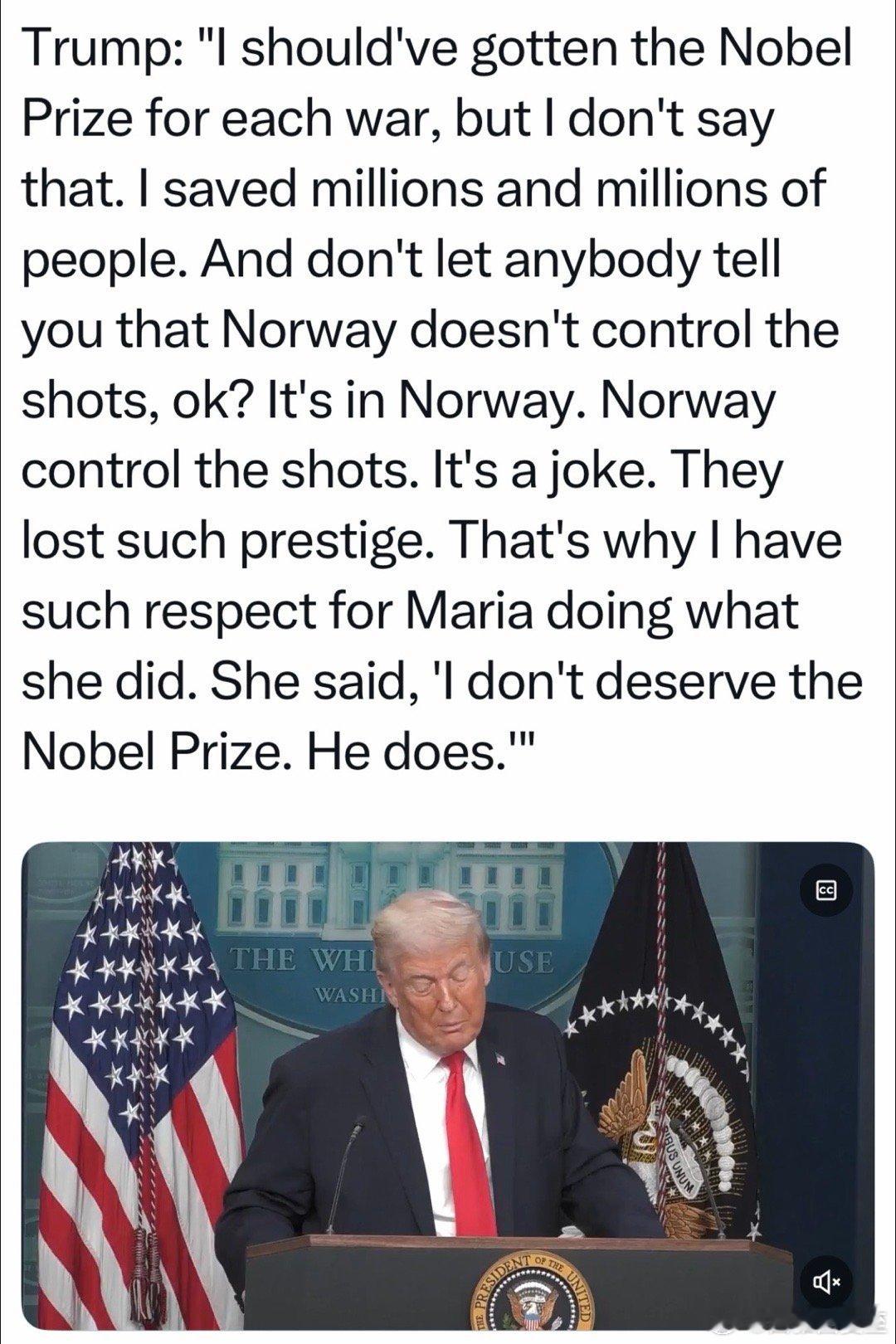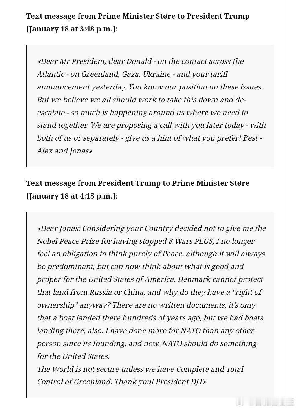 美国总统发短信“不给我和平奖,就别想和平了”(图一)CNN挖到引出这段话的前因(图二)挪威首相代表他自己和芬兰总统,给Trump写的短信:在格陵兰、加沙、乌克兰问题上,我们的立场,你很清楚…我们觉得,现在应该降温…现在发生了这么多事,我们应该更团结…我们想给你打个电话,两人一起或单独谈,都可以…(注:庆祝Trump2.0一周年的新闻会上,总统又提“和平奖”:我阻止的每一场战争,都应该给我发个奖…别信挪威说的“控制不了”,奖在挪威、就是挪威控制…这个奖完全失去声望了,简直是个笑话…Maria说得对:她不值得诺贝尔奖,我才应该得)