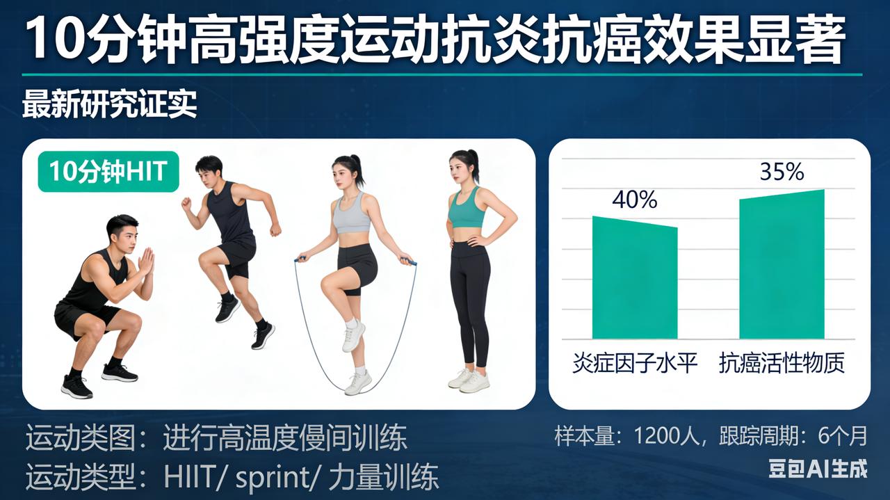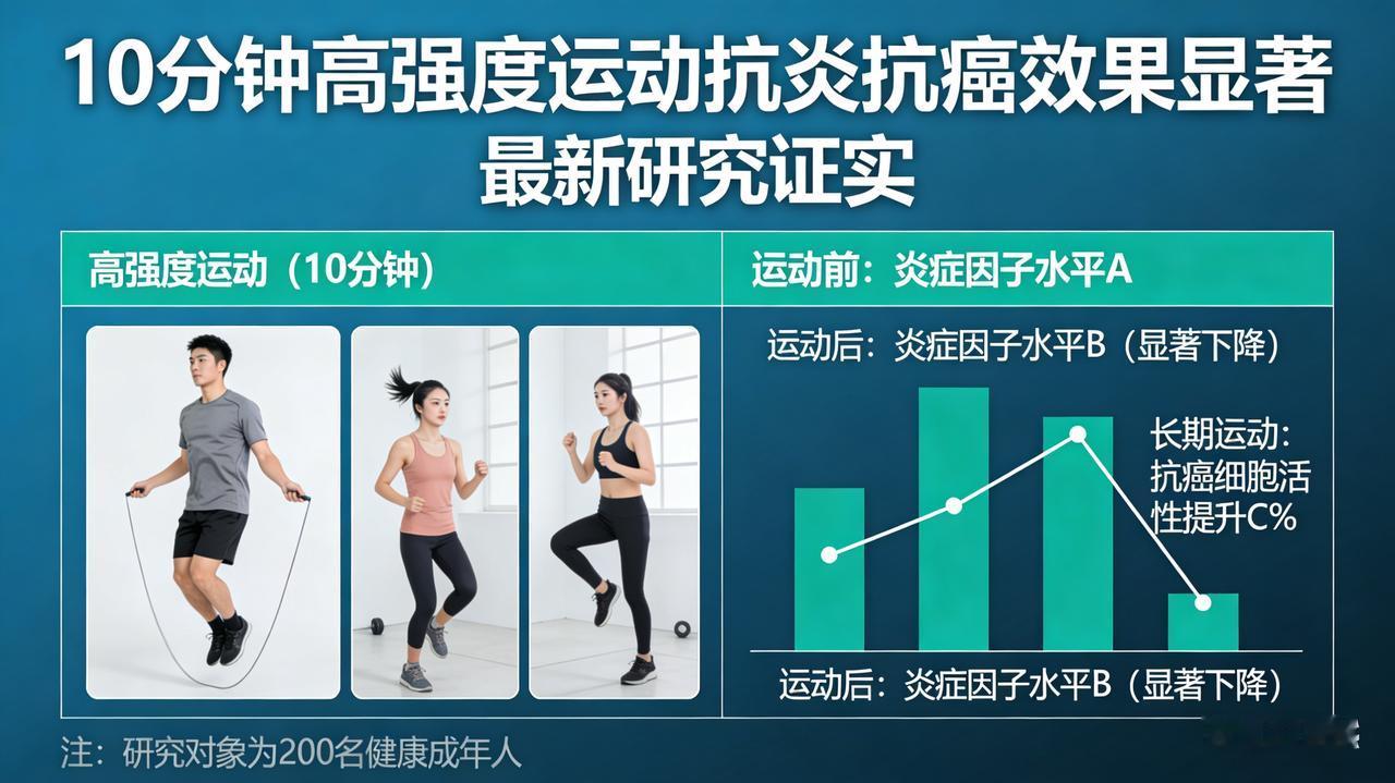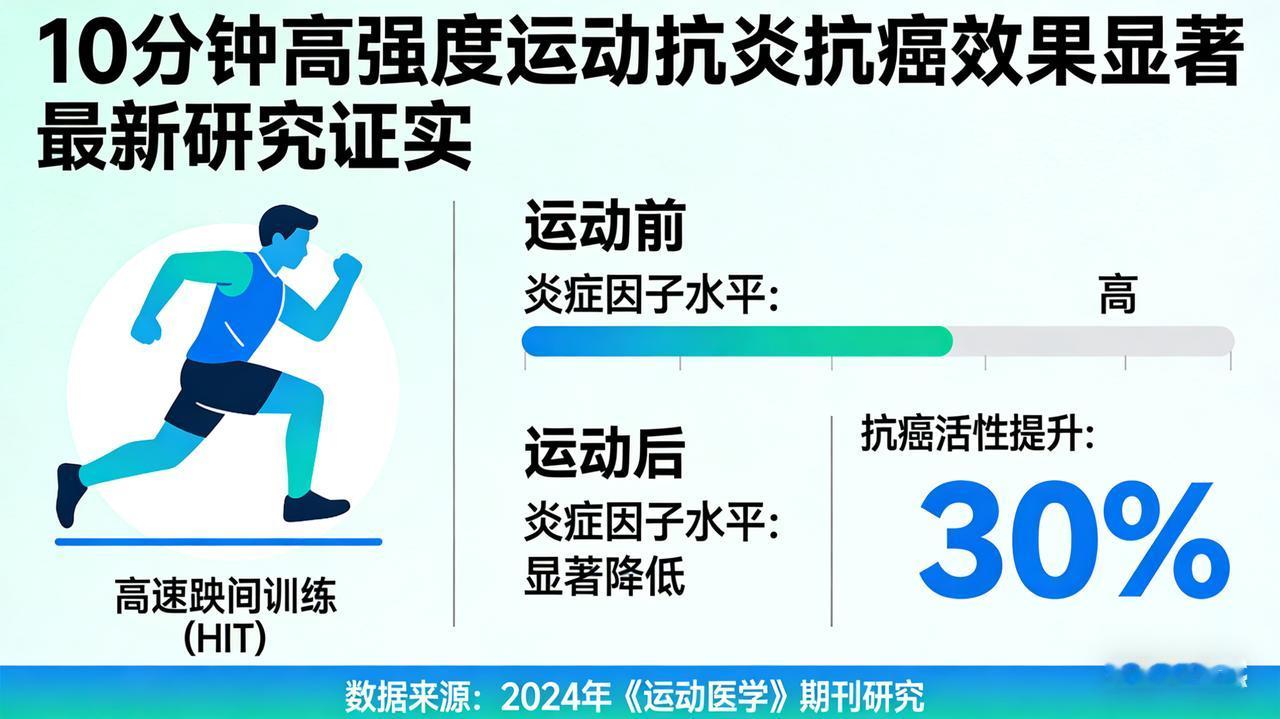 10 分钟高强度运动抗炎抗癌效果显著,研究证实 【健康突破】运动是“天然消炎药”?最新研究实锤:仅需10分钟,激活免疫“特种部队”! 本报讯还在依赖布洛芬对抗慢性炎症?一项震撼医学界的新发现或许能改变你的认知:运动,才是最高效、零副作用的“抗炎药”! 发表在《国际运动营养学会杂志》的重磅研究显示,仅仅10分钟的中高强度运动,就能让血液中的抗炎因子IL-6(白介素-6)浓度激增,像“消防员”一样迅速扑灭体内的炎症火苗。这一反应速度之快,甚至在运动停止后仍能持续数小时。 揭秘“10分钟”背后的科学 当你开始快走、开合跳或爬楼梯,心率达到最大值的60%-70%时,骨骼肌会瞬间释放大量肌动蛋白。这些蛋白不仅供能,更化身为“抗炎信使”,强制抑制TNF-α等促炎因子的活性。对于久坐的现代人,这种“运动零食(Exercise Snacking)”策略堪称救星——无需连续锻炼1小时,碎片化的10分钟爆发,就能显著降低C反应蛋白(CRP)水平,效果堪比低剂量抗炎药。 专家定制“抗炎处方” “别把运动想得太复杂,”研究主导者、加州大学圣地亚哥分校运动医学专家建议:“等咖啡时做50个深蹲,或者午饭后快走10分钟,只要微微出汗、呼吸急促,就是在给血管做‘深层清洁’。” 特别提醒 相比药物治标不治本,运动产生的内源性抗炎物质能精准修复受损组织。从今天起,把刷手机的10分钟换成“高强度间歇”,你的关节、血管和免疫系统都会感谢你!动起来,就是最好的“排毒”方式!