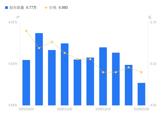 近一年(2025年1月20日至2026年1月20日),安凯客车A股股东户数从5.89万户,减低至4.77万户,降幅19.03%,区间股价下跌10.27%。