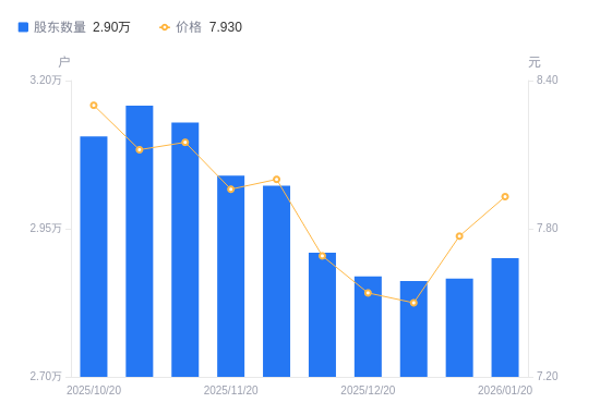 日期A股户数(户)流通A股户均持股数(股)户均持股市值(万元)2026-01-202900512761.5810.122026-01-102865812916.1010.042025-12-312861812934.159.702025-12-202869512899.459.732025-12-102909712721.239.782025-11-303022412246.889.802025-11-203039412178.389.692025-11-103129311828.519.642025-10-313157811721.769.522025-10-203106011917.249.89
