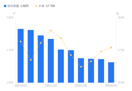 日期A股户数(户)流通A股户均持股数(股)户均持股市值(万元)2026-01-201656812702.3422.482026-01-091681012519.4821.782025-12-311683612500.1420.802025-12-201688512463.8720.222025-12-101750012025.8520.592025-11-201754611994.3222.112025-11-101836611458.8021.792025-10-311863711292.1820.392025-10-201905211046.2118.502025-10-101913610997.7219.98