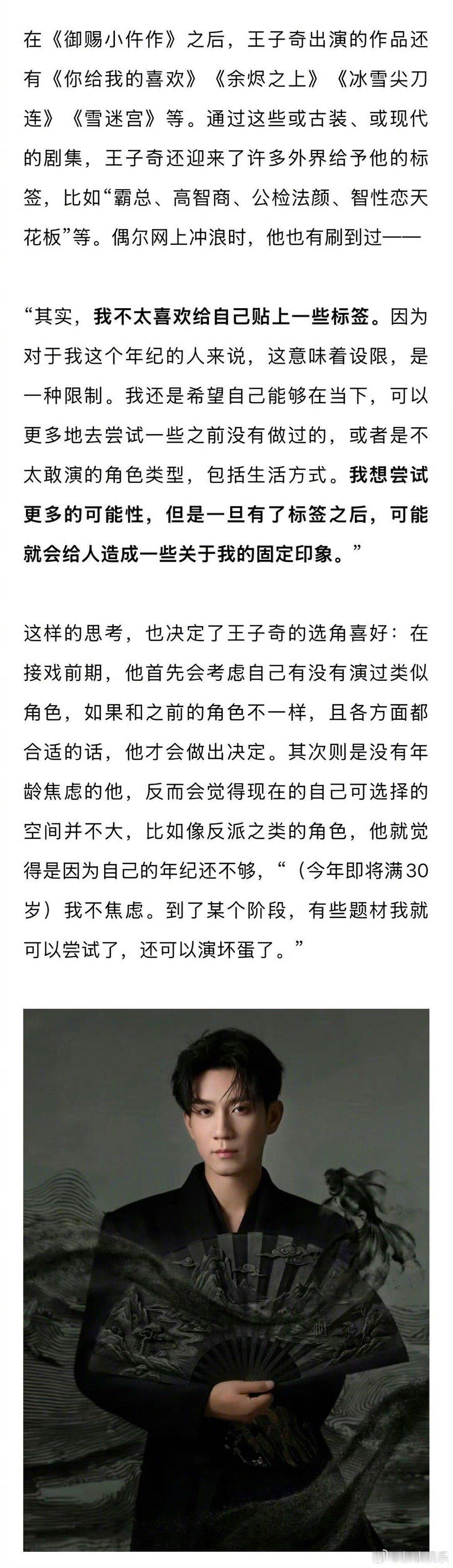 王子奇说自己无法拒绝萧瑾瑜 被王子奇对待年龄的态度打动了。他觉得年龄增长不是焦虑,反而是一种财富,让人更平静,经验更丰富。他还开玩笑说保养好的话,二十多岁的脸既能演三十多岁的角色,也能演二十多岁的。这种坦然和自信,很有魅力。