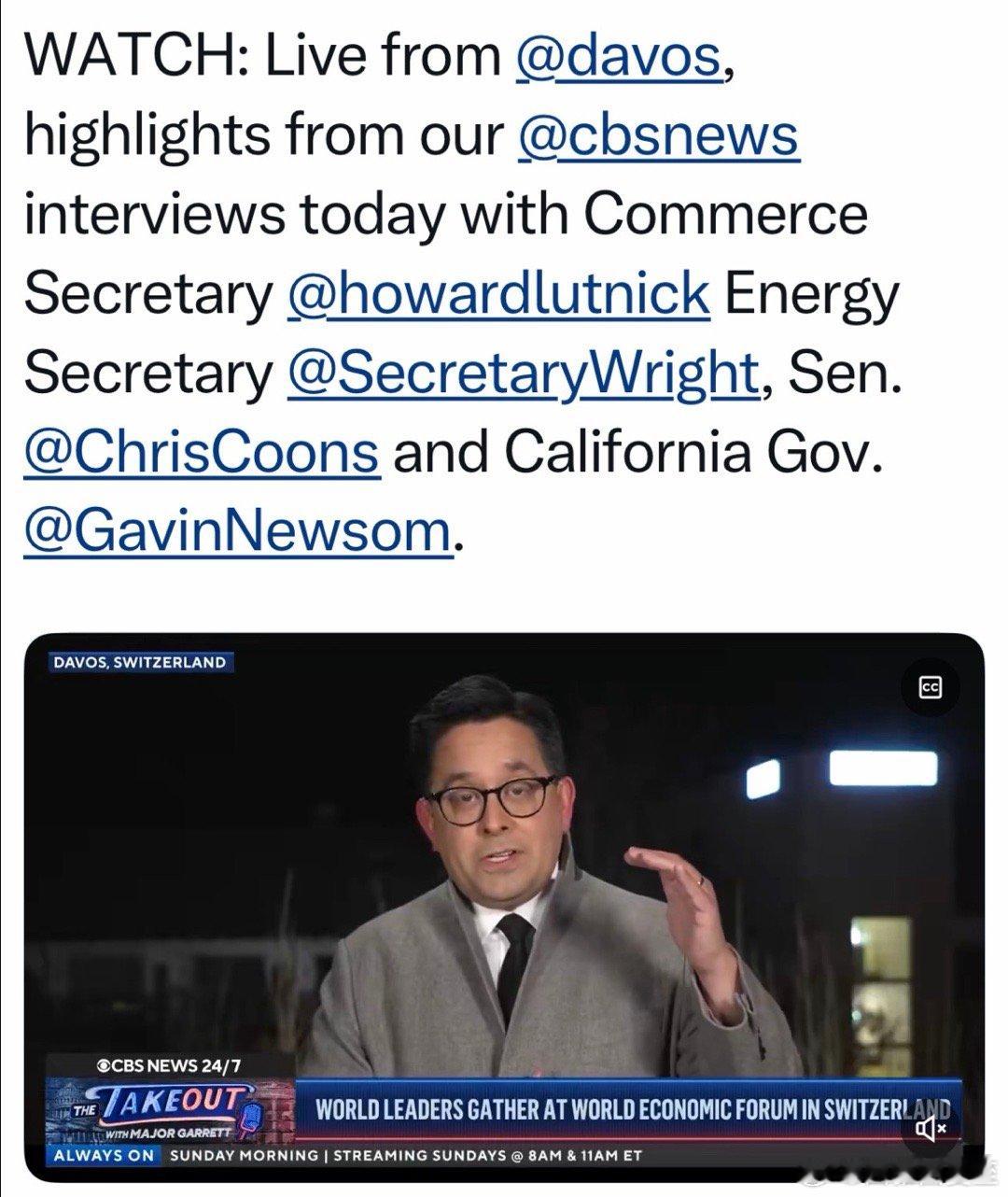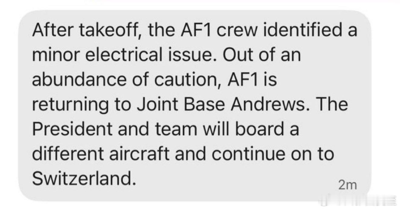 美国总统乘空军一号,前往达沃斯出发不久,即掉头回到空军基地白宫声明:机组发现“不重要的电子故障”,为保险起见,换另一架总统专机,去达沃斯的计划不变(注:同机除了正副幕僚长、发言人等白宫高层,还有国务卿;财政、商务、能源等内阁成员,各自单独前往;副总统不参加论坛)