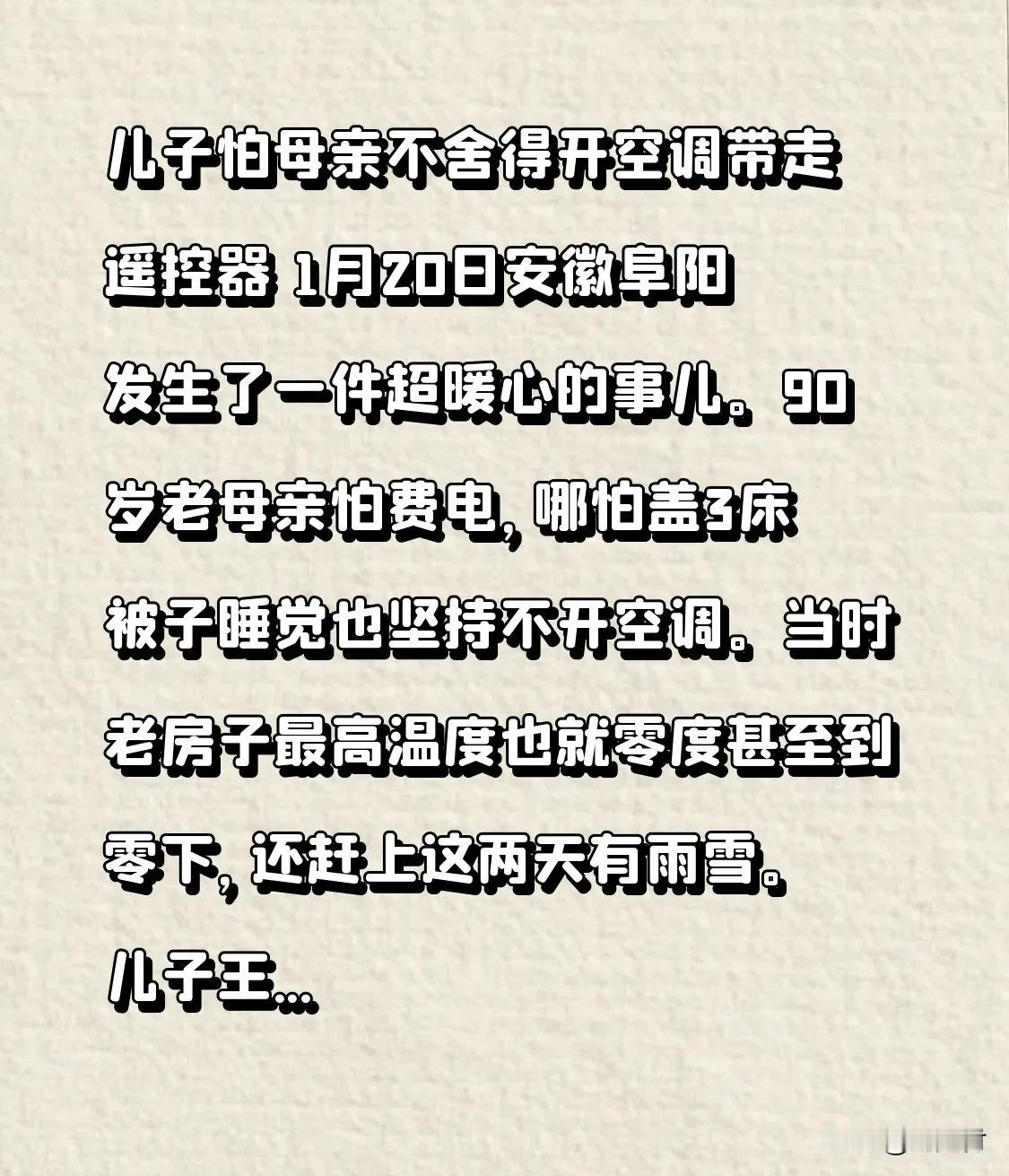 儿子怕母亲不舍得开空调带走遥控器 1月20日,安徽阜阳发生了一件超暖心的事。90岁的老母亲怕费电,即便盖三床被子睡觉,也坚持不开空调。当时老房子最高温度也就零度,甚至到零下,还赶上这两天有雨雪。儿子王先生了解母亲的“固执”,特意赶回老家,打开空调后带走遥控器,打算等天气暖和了再回来关。 老一辈人省了一辈子,勤俭节约已成本能。对子女而言,电费哪有父母的温暖重要。儿子这“霸道”的做法,虽不讲道理,却是最直接的爱。爱就是如此,在代际间会找到特别的方式,让彼此都好。 家长自费安空调 爸爸装空调