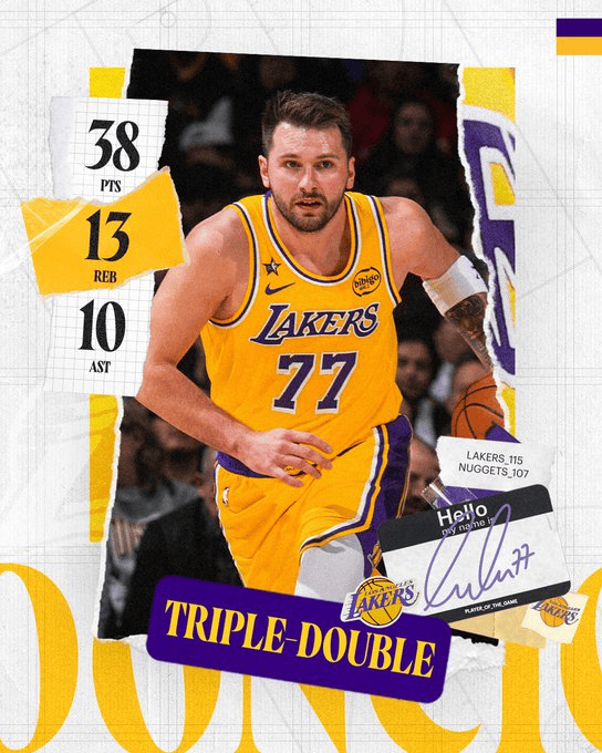 赛后,湖人官方分享东契奇数据海报,并配文道:“达成三双!”