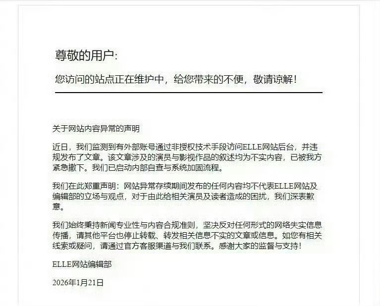 搞事都到这种程度了吗,居然有人跑去ELLE杂志官网,用技术手段发布黑对家的文章,现在ELLE发声明,已紧急撤稿 ELLE 影视创作须回归本源