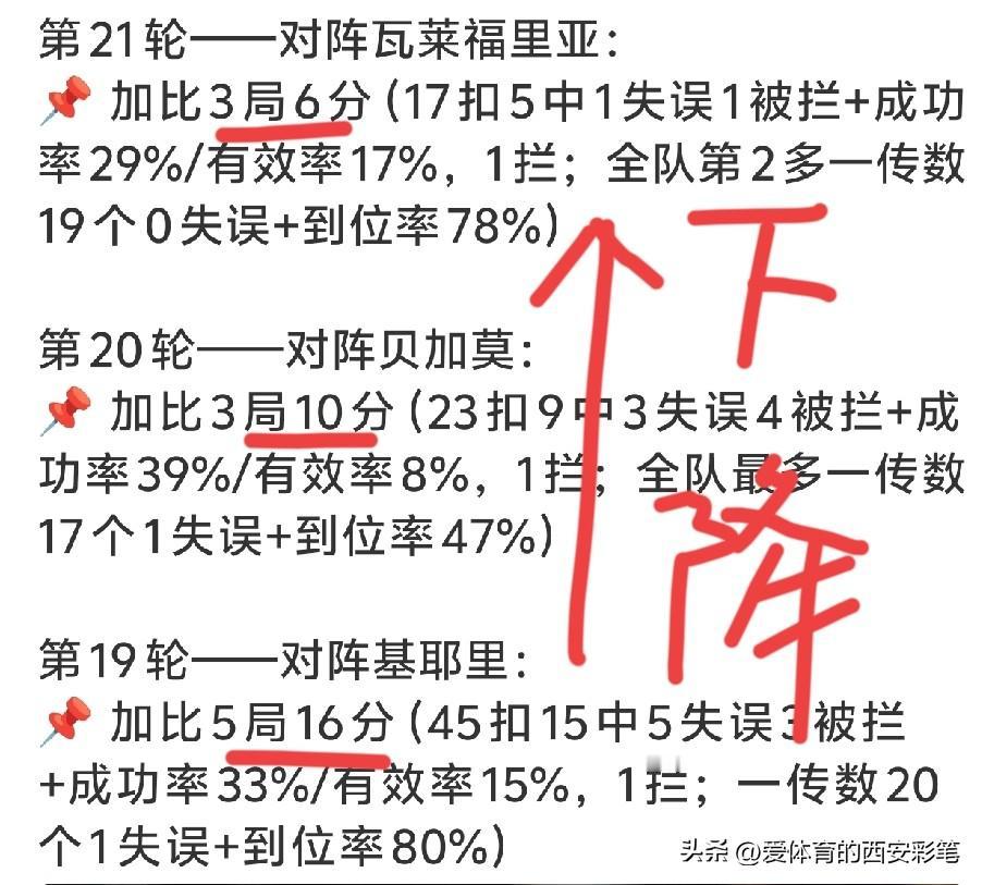 已续约的加比,进攻得分从2位数掉到1位数,状态越来越差 原来遇到防守好和拦网高的队伍,加比不是被防,就是被拦,再加上调整攻也不是她的强项,所以数据越来越不好。 好在,她的一传和防守,一直是队伍不可或缺的,要不然,真的要被桑塔雷利安排到替补席了。看看你的搭档,朱婷,状态越来越好了,加油吧,加比。排球运动员加比 女排加比 哈克加比