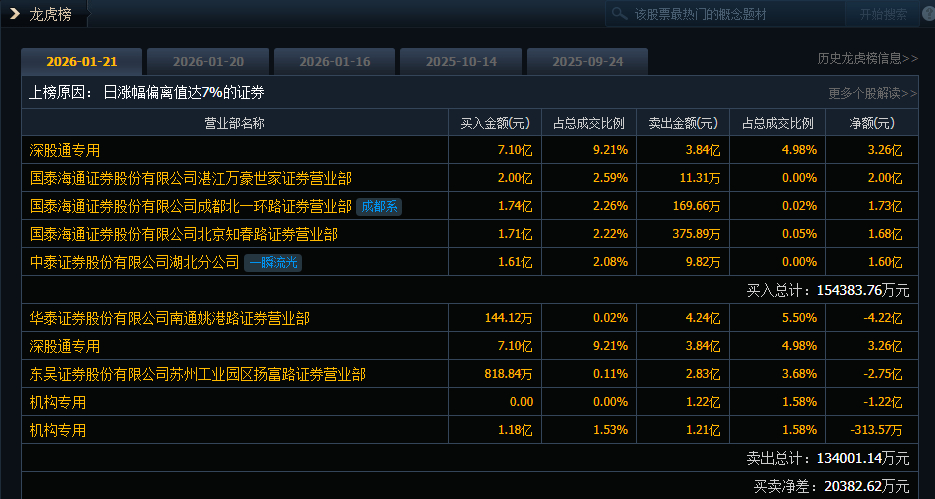 通富微电(002156)今日涨停,成交额77.07亿元,换手率9.39%,盘后龙虎榜数据显示,深股通专用席位买入7.10亿元并卖出3.84亿元,有2家机构专用席位净卖出1.25亿元。