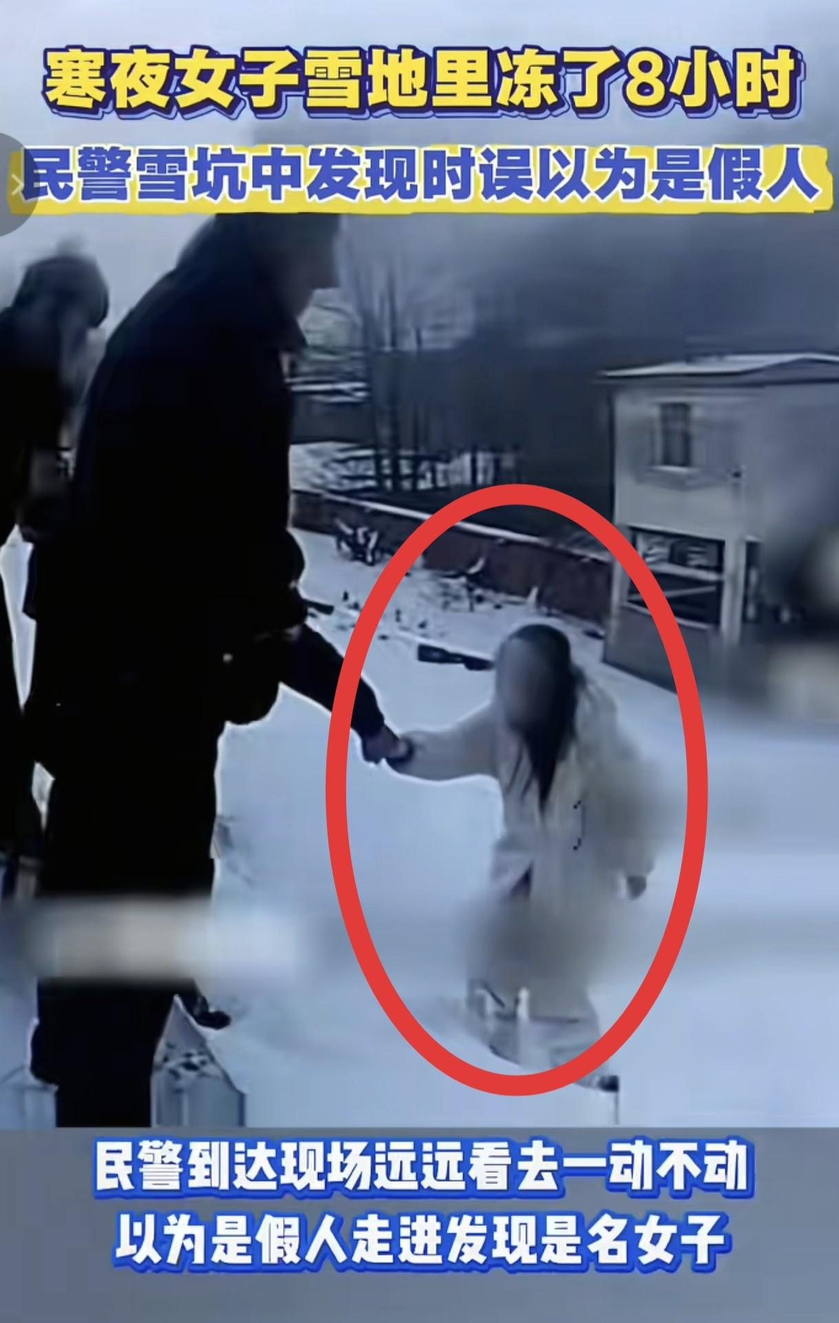 她躺在雪地里, 民警以为是假人, 发现时还活着。 那天早上,蚌埠淮河大坝上积着厚厚一层雪。 巡逻的民警看见远处雪坑里躺着个人,一动不动,穿得单薄,像被丢弃的模特。 走近了才发现,她的眼珠微微动了一下,脸都冻紫了。 没人知道她是怎么熬过这八个小时的。 零下好几度,只穿睡衣,在雪里躺着,呼吸几乎感觉不到。 民警脱下警服盖她身上,抬上车送医院。 路上一直喊她,怕她睡过去。 医生说能活下来算幸运。 雪坑挡了点风,身体不动也少耗热。 要是再晚半小时,可能就救不回来了。 她没严重冻伤,但精神状态不太稳定,邻居说平时话就少,家里也不太和睦。 很多人第一眼看到她,都没觉得是真人。 现在路上摆个模型太常见了,谁会多看一眼。 可正是那个多看一眼的民警,把她从死里拉了回来。 她不是想死,可能只是太累了,想让谁注意到她。 可如果不是那几分钟的坚持,一切都结束了。 她动了下眼睛,命就保住了。