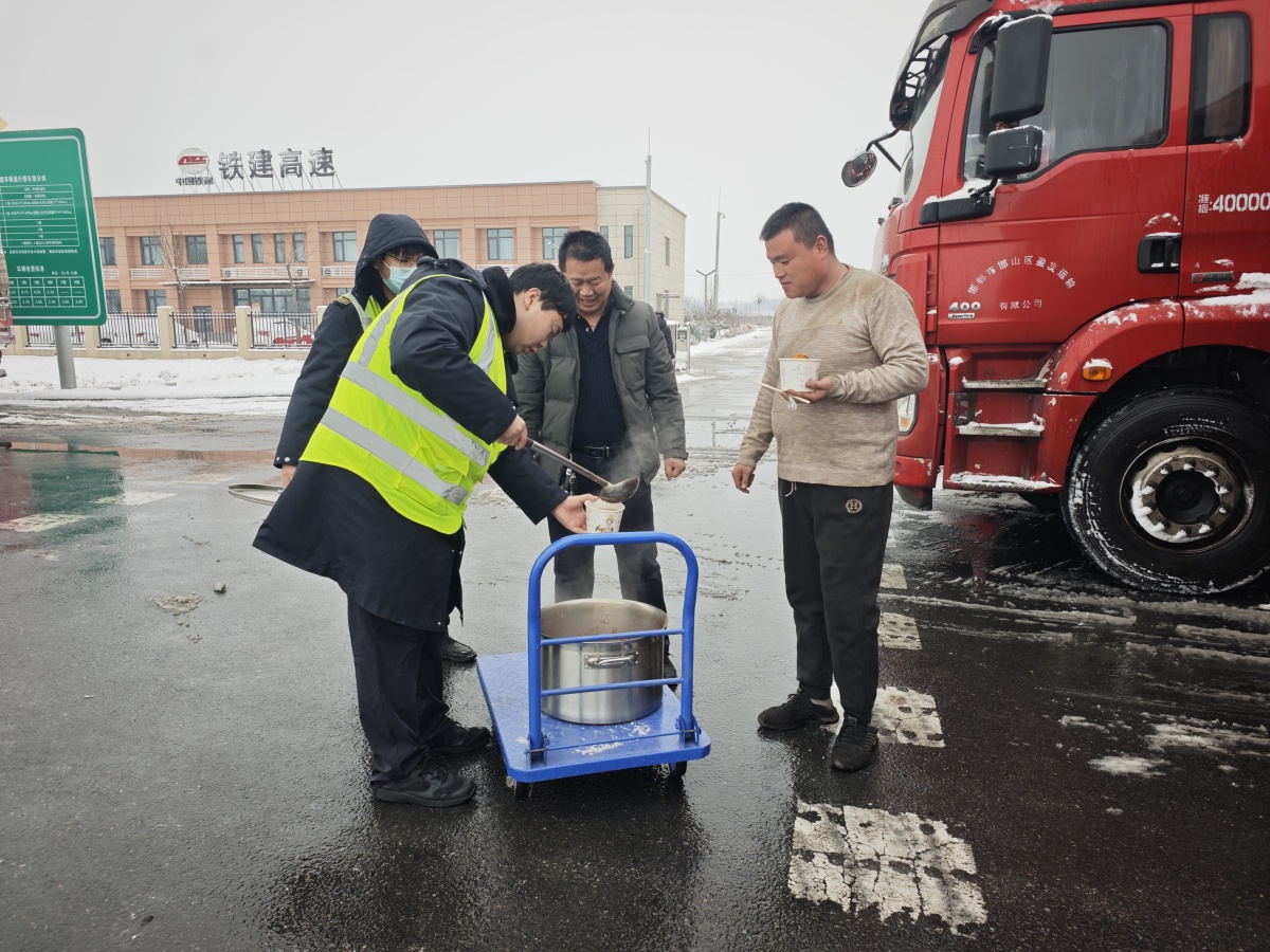 低温导致路面结冰,部分货运车辆滞留。原阳南收费站迅速开启“温情服务”模式,在做好除雪保畅的同时,第一时间为司乘送去热粥、饭菜和鸡蛋等食物。当一碗碗热气腾腾的粥递到滞留司机手中时,一位来自河北的货车司机感动地说:“本来被困在路上又冷又饿,没想到收费站的同志还想着我们,心里一下子就暖了。”