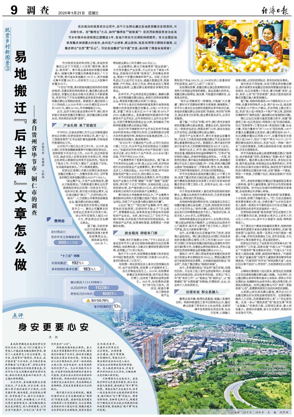 在决战决胜脱贫攻坚过程中,近千万名群众通过易地扶贫搬迁告别贫困,开启新生活。在“搬得出”之后,如何“稳得住”“能致富”?在巩固拓展脱贫攻坚成果同乡村振兴有效衔接过渡期这5年,各地不断织牢后续扶持保障网。作为全国易地扶贫搬迁规模最大的省份,贵州在产业培育、就业扶持、社区治理等方面精准施策,让搬迁群众“安居”更“乐业”。写好易地搬迁“后半篇”文章,贵州做了哪些有益探索?