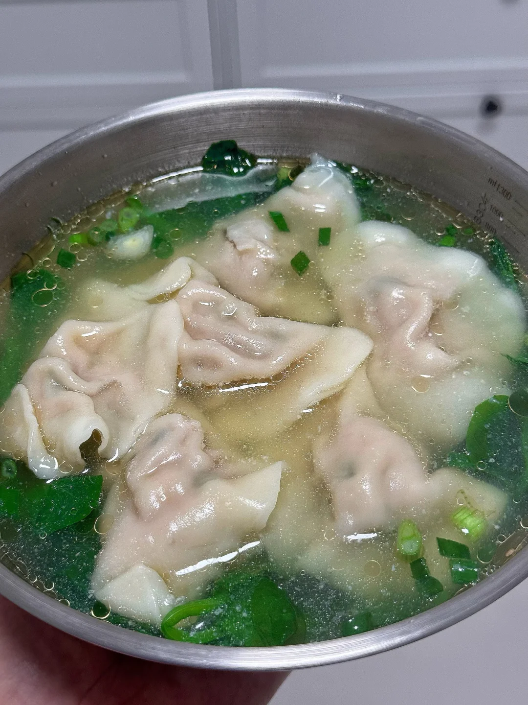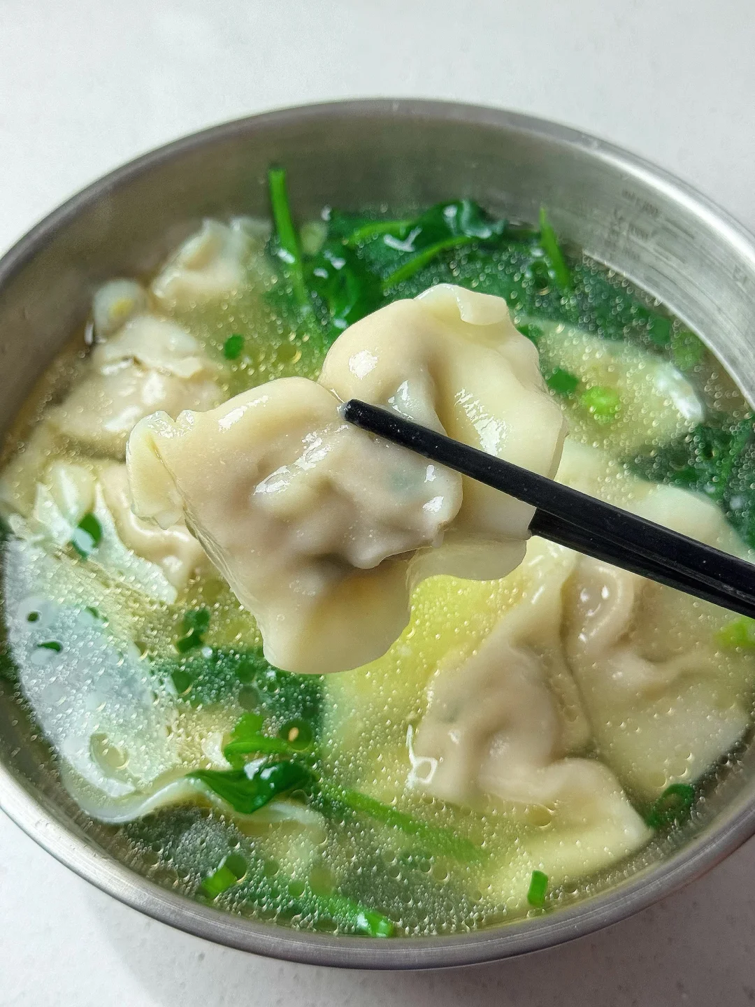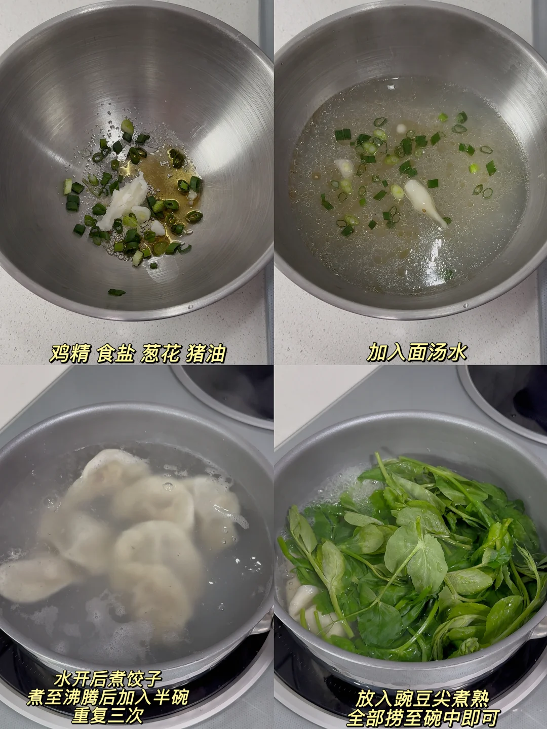 清汤饺子好吃又鲜,每次都能把汤喝完~ 🍳做法: 1.碗中放适量鸡精,食盐,葱花,猪油,加入面汤水 2.水开后煮饺子,煮至沸腾后加入半碗冷水,重复三次 3.放入豌豆尖煮熟,全部捞至碗中即可。