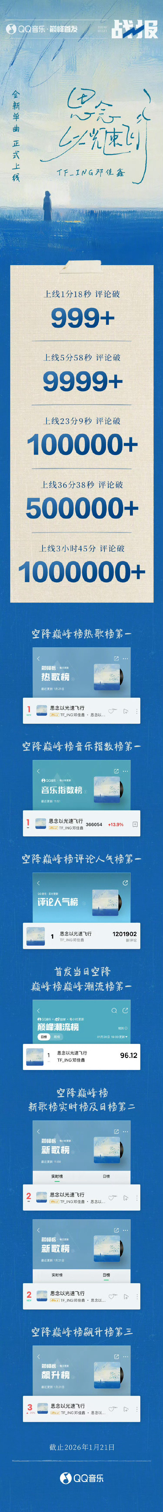 邓佳鑫思念以光速飞行战报邓佳鑫新歌热度 邓佳鑫新歌热度,邓佳鑫思念以光速飞行战报来袭,空降巅峰榜热歌榜+音乐指数榜+评论人气榜+巅峰潮流榜第一,咱就说稳稳的热度谁能不说一句好听呢~