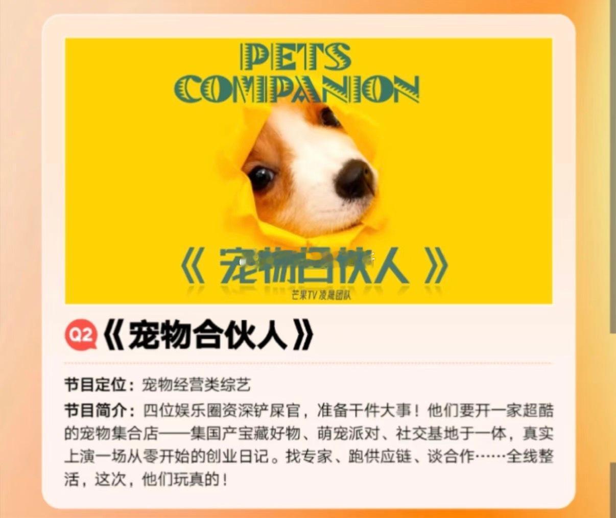 芒果🥭TV综艺《宠物合伙人》嘉宾:赵露思、陈哲远、李佳琦、孟子义、丁禹兮、常华森、张予曦、陈立农等(拟邀)简介:四位娱乐圈资深铲屎官,准备干件大事!他们要开一家超酷的宠物集合店--集国产宝藏好物、萌宠派对、社交基地于一体,真实上演一场从零开始的创业日记。找专家、跑供应链、谈合作……全线整活,这次,他们玩真的!