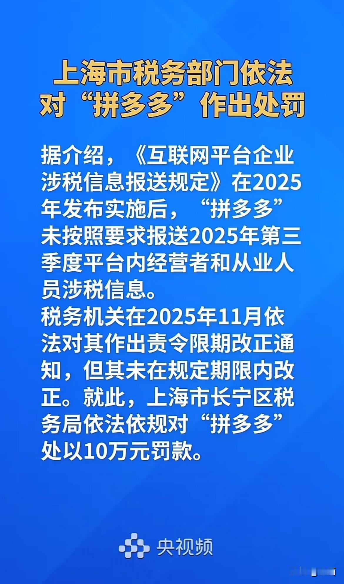 拼多多被罚款18万,“尖子生”也有犯错误的时候。 这次对拼多多的罚款,上海税务部门也给出了原由:2025年11月份曾责令拼多多限期报送2025年第三季度平台内经营者和从业人员涉税信息。不知道为什么拼多多却没有当回事。所以,1月份处罚来了。 之前是“悄悄”的告诉了拼多多,你把错误改了,就不让别人知道了。 谁知道,拼多多知错不改。“老师”只好当着全班的面,宣布要惩罚这位“尖子生”了。 10万元的罚款,对拼多多而言,伤害性不大,但“侮辱”性高。丢人呀!