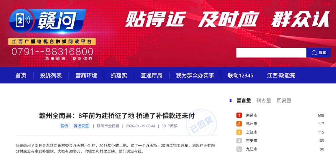 《赣问》平台转来的《赣州全南县:8年前为建桥征了地桥通了补偿款还未付》已收悉。