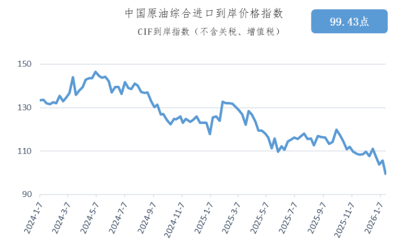 1月21日,海关总署全球贸易监测分析中心和上海石油天然气交易中心联合发布的中国原油综合进口到岸价格指数显示1月12日-18日,中国原油综合进口到岸价格指数为99.43点,周环比下跌5.82%,同比下跌20.80%。