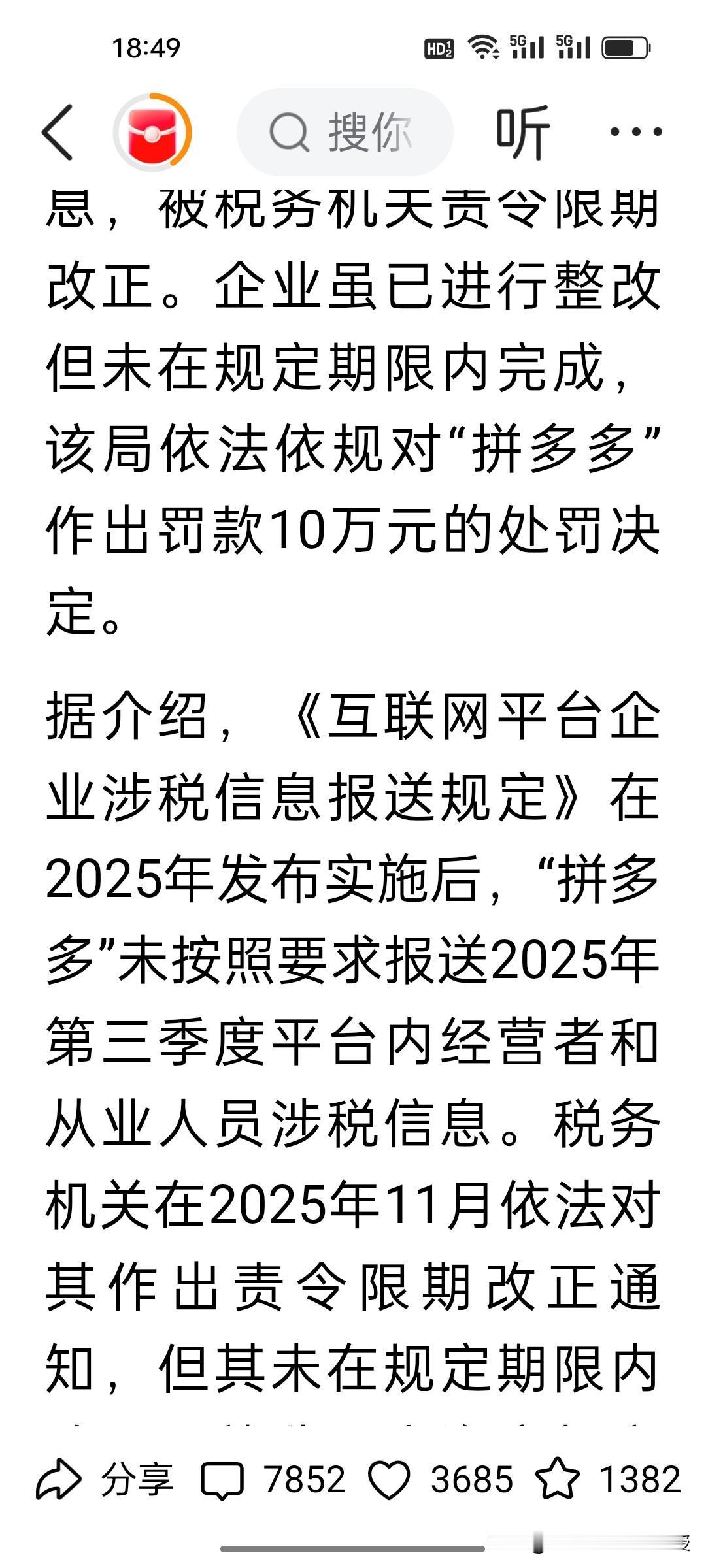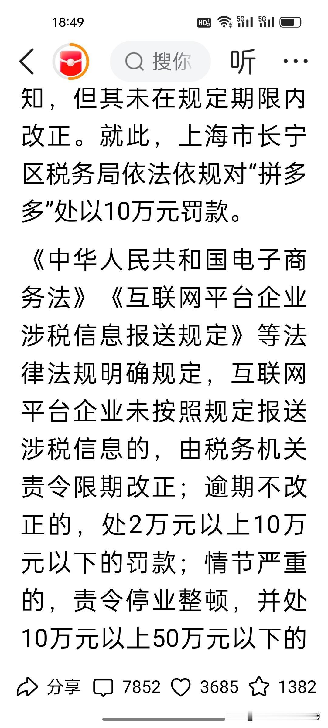 拼多多被罚了10万元,不是因为卖假货,而是因为未按照规定报送涉税信息。这个罚款的警示意义大于罚款本身,但让人意外的是,评论区没见吐槽,反而满屏都是好评。 为啥大家这么买账?就因为拼多多的售后太贴消费者——退货秒通过、质量问题免运费,维权时从不让人费心扯皮。网友纷纷喊话:“比起某些平台的售后壁垒,拼多多这波站消费者的操作太圈粉”。 罚单是合规的警钟,而消费者的好评是民心的投票。守住规则底线,更守住用户权益,这才是平台长久走下去的关键!