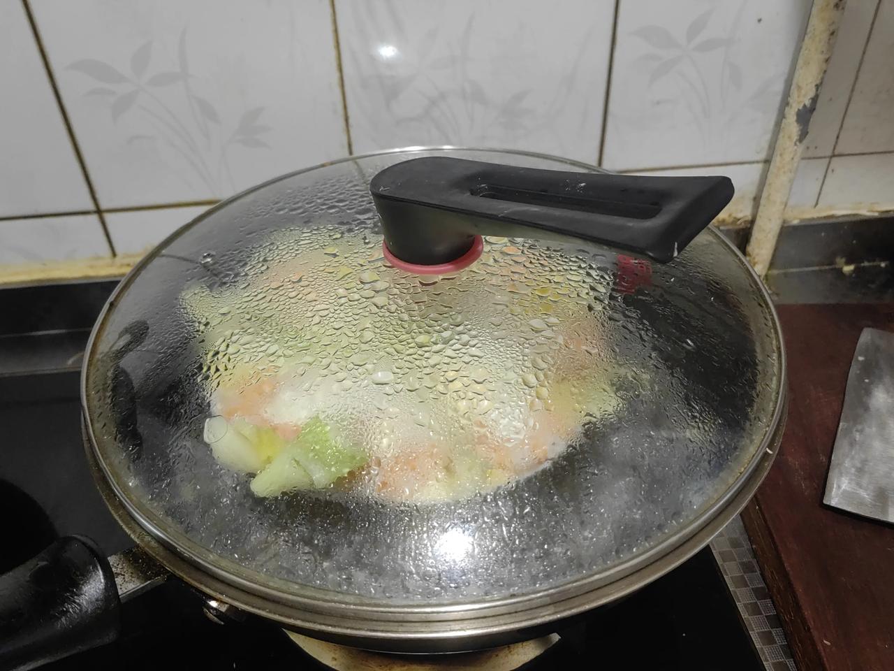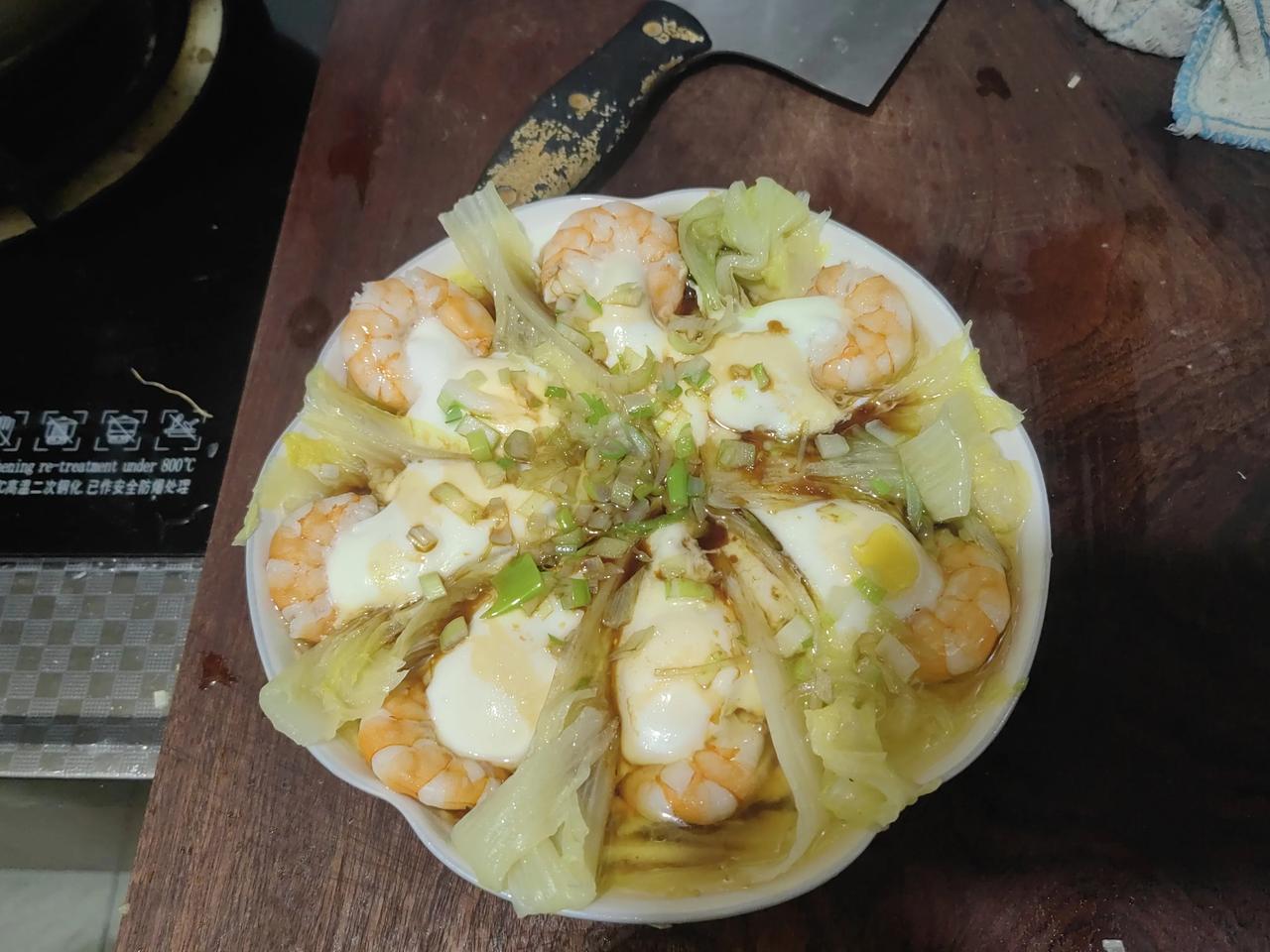 今天晚上老伴做了一个我们全家都不认识的菜。 老伴说是从手机上学来的,也忘了这个菜叫什么名字。 这个菜用了一个白菜心,7个鸡蛋7个大虾,放到锅里蒸熟以后洒上葱末,再浇上滚烫的热油,最后倒上点味极鲜就算完成了。 还别说,这个菜的味道还真不错,被俩孩子吃了一大半。 有人知道这个菜的名字吗?