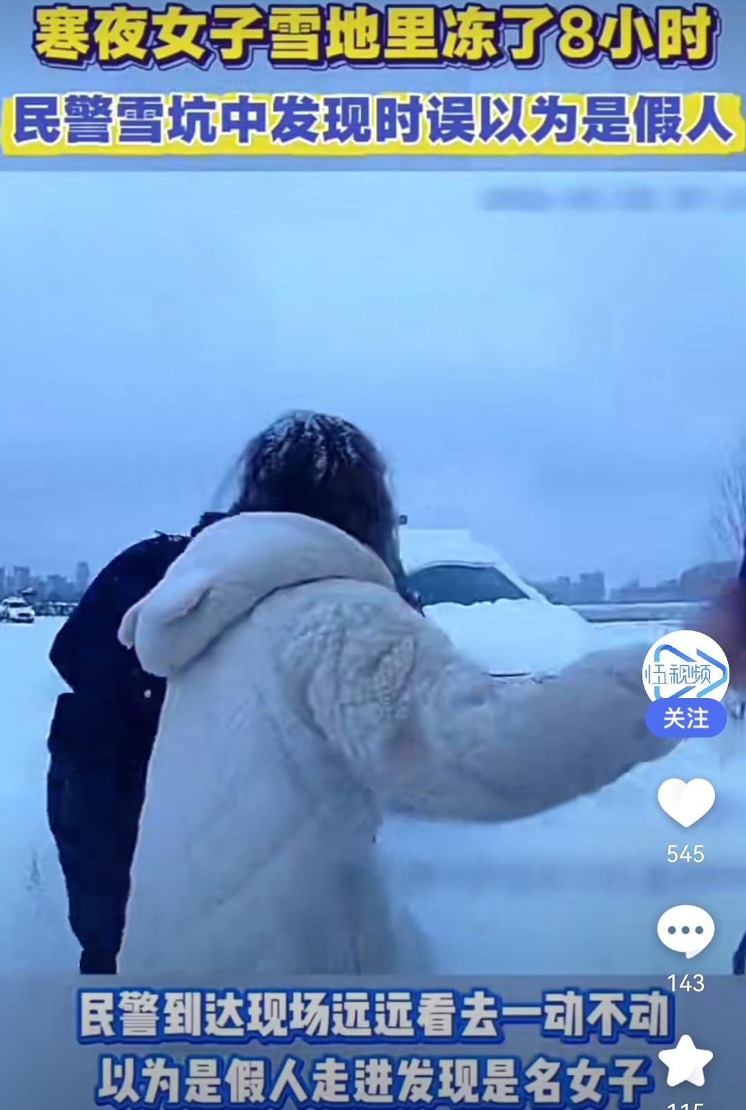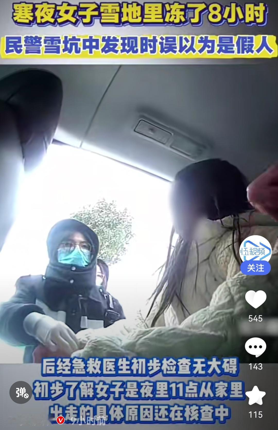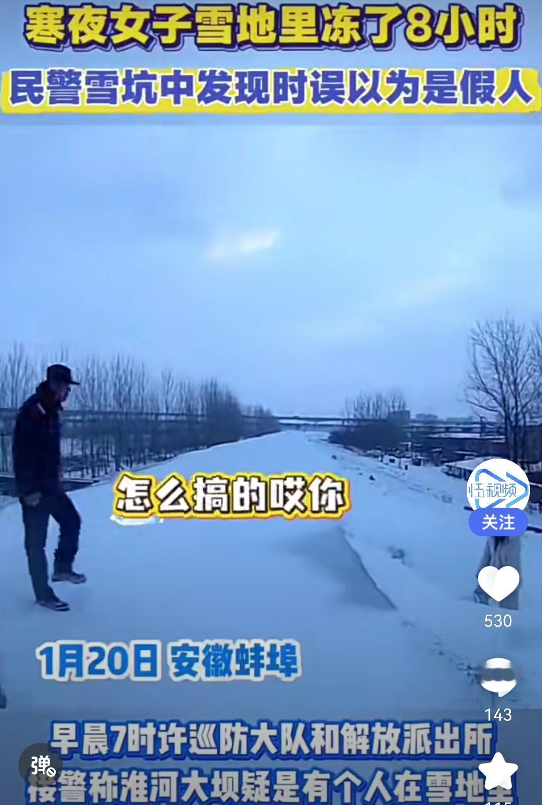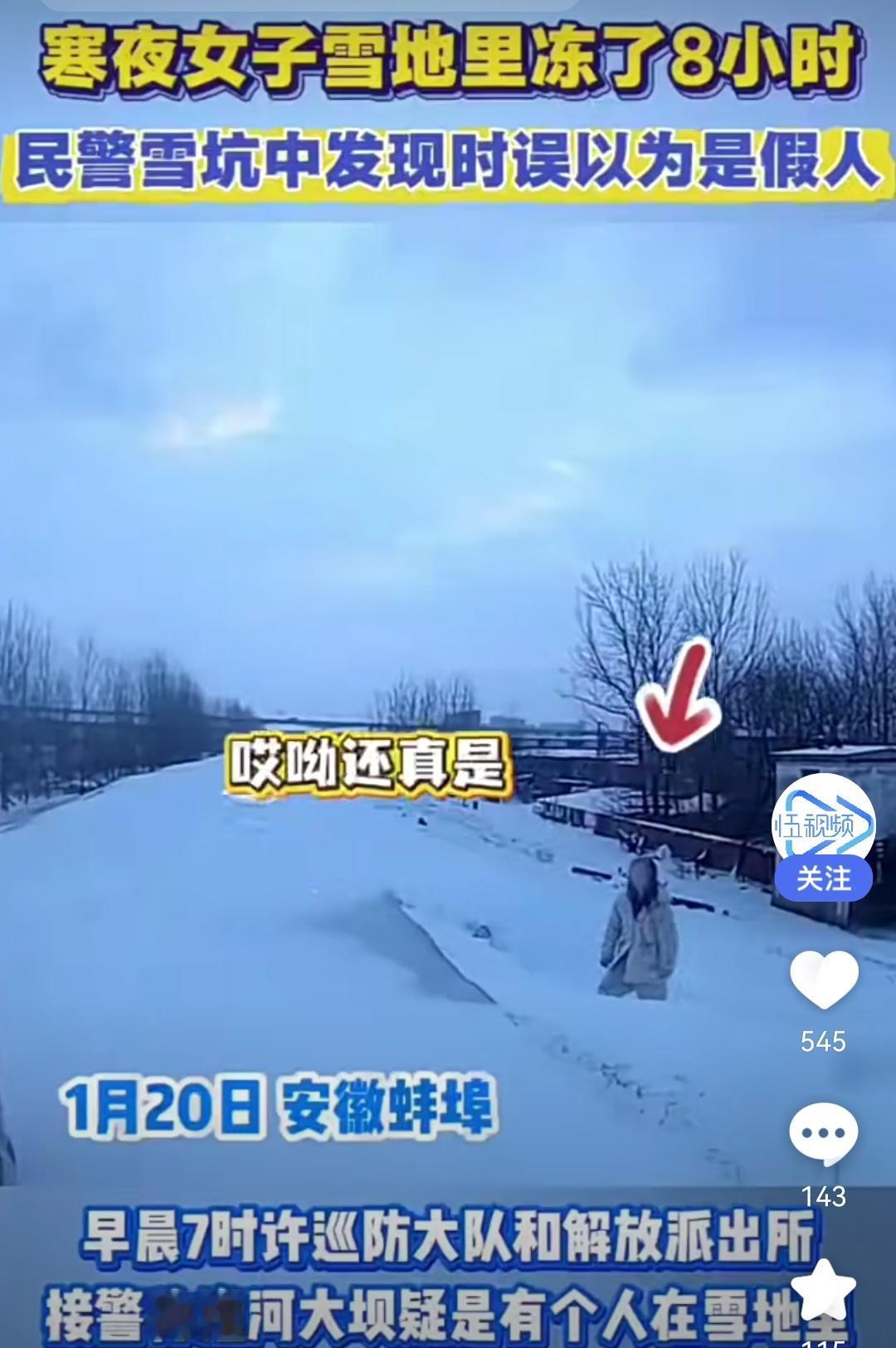 1月20日安徽蚌埠,早晨7点多,民警接到报警称淮河大坝疑似有个人在雪地里,民警到达现场远远看雪地里一动不动的以为是个假人,走近才发现是名女子。 据了解她前一晚11点从家里出走,在雪地里冻了8小时。好在民警及时把她从雪坑救出来,送上警车开空调保暖,医生检查后说她没大碍。 虽然不知道她为何会在大雪天夜晚出门,而且一直不回家,直到第二天早上才被人发现,但她这种行为却是不可取的。天气本来就寒冷,再加上是夜晚还下着雪,万一出点什么意外,后悔都来不及,更别说天寒地冻的在外容易冻伤,好好的不觉得,真的冻伤了,每年冬天就难过了。大家说是不是这个理儿? 再说了,何必没苦硬吃,自己为难自己呢!你这样做除了父母有人心疼你吗?做完之后会不会觉得自己很傻?
