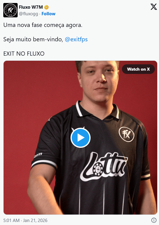 虎扑01月21日讯Fluxo战队官方宣布正式签下exit,接替arT的首发位置,arT此前于1月8日被Fluxo战队下调至替补阵容。然而,这位前MIBR队长并不会接管Fluxo战队的指挥职责,战队指挥将继续由Lucaozy承担。