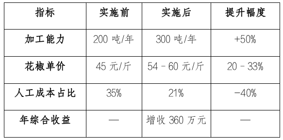 减损降耗:机械化加工精准控制分拣、存储环节损耗,减少花椒霉变损失15%,年节约原料45吨,相当于保护120亩椒园的产出;绿色生产:除尘设备有效降低加工环节粉尘污染,可降解包装材料减少固体废弃物30%,符合山区生态保护要求。