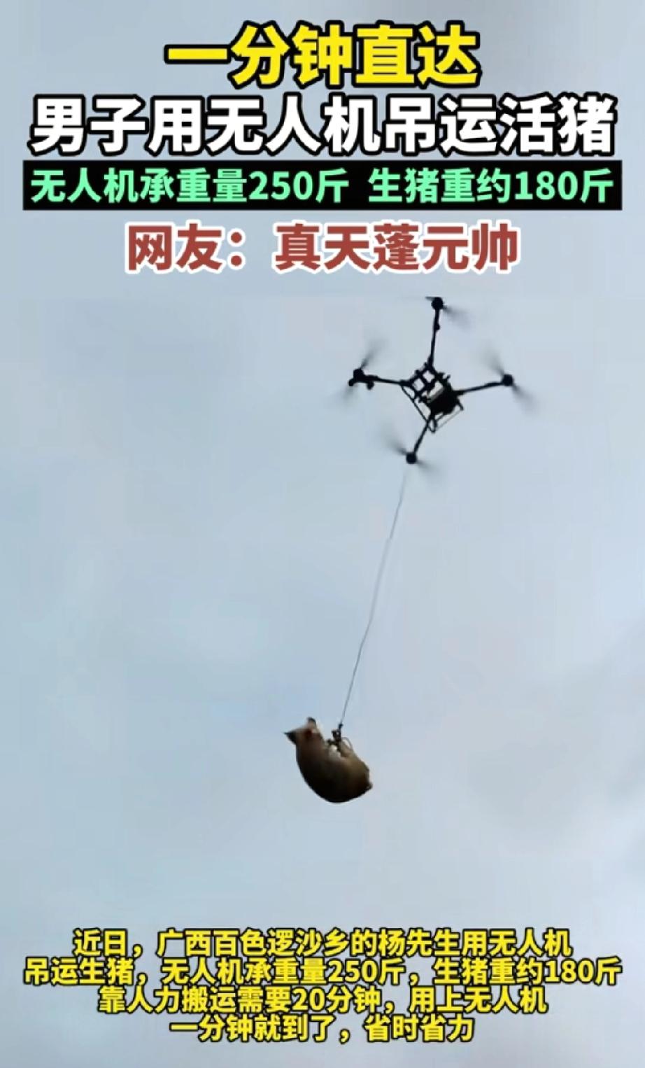 笑不活了!广西百色,杨师傅在山上做墓碑,但因为山高路远,弄吃的不方便,就灵机一动,用无人机吊着生猪上山,平时20分钟的路程一分钟就到了。网友:猪这辈子都没想到有一天能上 杨师傅平时就在深山里干活,那地方山势陡峭,上下山一趟特别费劲,更别说还要带东西了。这次他琢磨着带只活猪上去,干活时能吃上新鲜肉。 可猪不听指挥,山路又远,要是硬赶上去,少说也得折腾二十分钟,人累猪也喘。 正发愁时,杨师傅一眼瞥见了手边的无人机。机器上标着最大能载重二百五十斤,而眼前这头猪大概一百八十斤——有戏!他马上找来绳子,把猪稳妥地绑好,稳稳挂上无人机。 一按开关,无人机带着猪“嗡”地腾空而起,沿着几乎垂直的山路笔直向上飞去。不到一分钟,就稳稳抵达了山顶。 这头猪恐怕做梦也没想到,自己竟以这种“飞天”的方式完成了上山之旅,真成了网友口中的“当代天蓬元帅”。 说实话,我打心底佩服劳动人民这种就地取材、灵活变通的智慧。杨师傅没抱怨环境,也没干等帮助,而是把现有的工具用在了最需要的地方。这虽然谈不上什么高科技,却是实实在在解决了大问题。 如今,像无人机这样的工具,正越来越多地融入普通人家的日常。它们不再只是拍视频、玩航模的玩具,在偏远的山区、在施工不便的野外,真能派上大用场——送点工具、运些物资,省时又省力。科技本该如此:为人服务,解决真问题。 说到底,最好的创新往往就来自对日常不便的那一点敏锐与不将就。杨师傅这次“无人机运猪”,正是把现有的技术用在了刀刃上。 科技从来不是摆在展厅里的模型,而是能走进生活、扛起重担的可靠帮手。让我们为每一位在生活中点亮智慧火花的人点赞!
