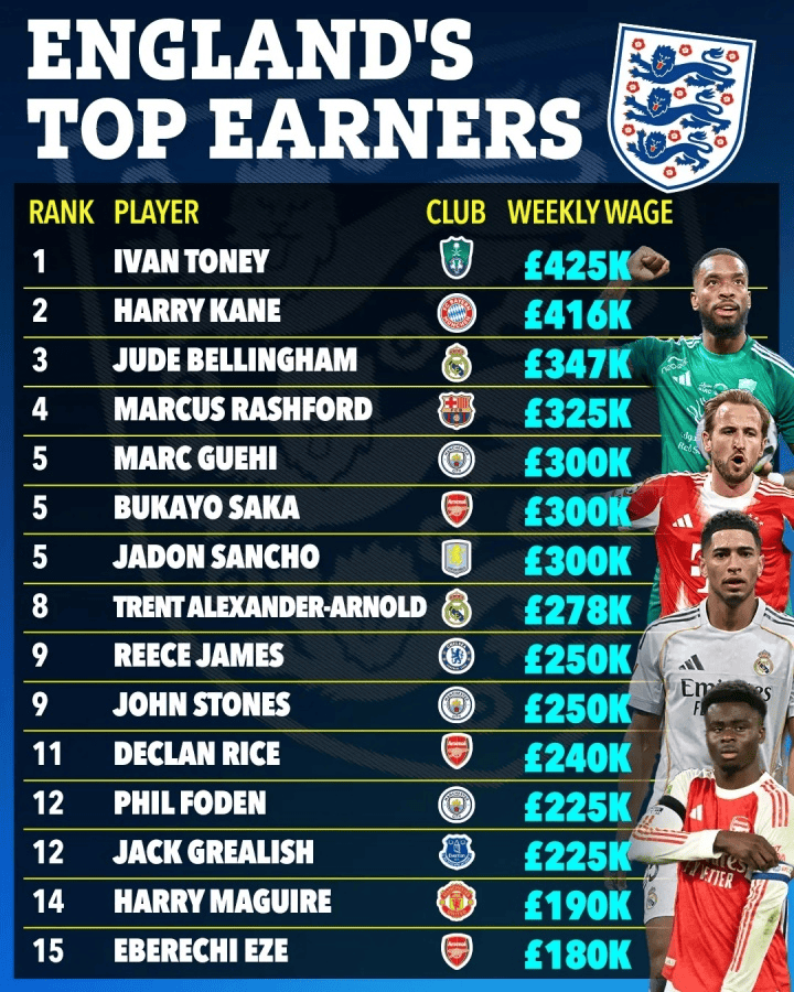 虎扑01月21日讯在水晶宫中卫格伊加盟曼城以后,据报道,这位英格兰国脚在蓝月亮的周薪高达30万英镑。《太阳报》也统计了英格兰球员周薪排行,效力于沙特联的伊万·托尼以42.5万英镑的周薪高居榜首。