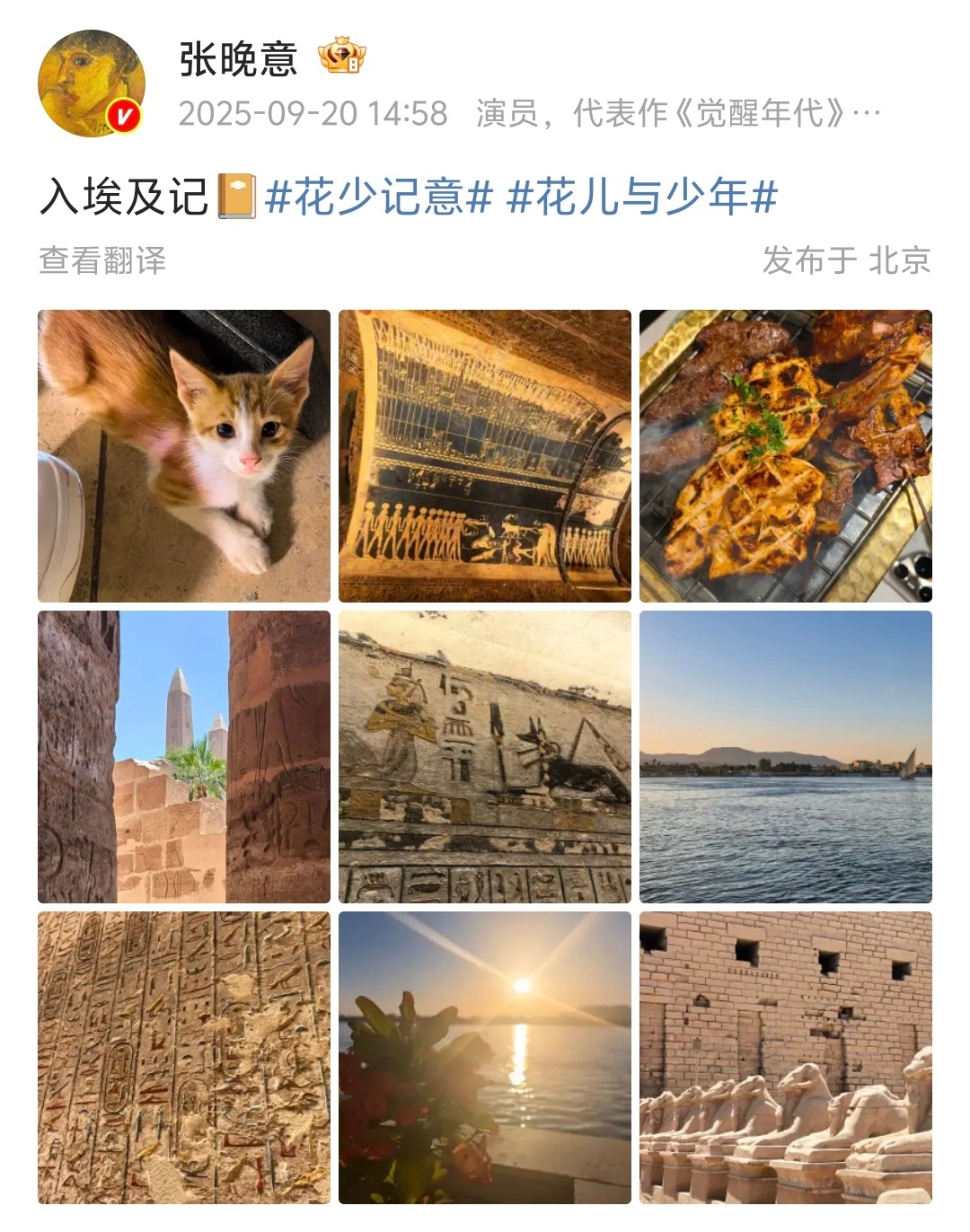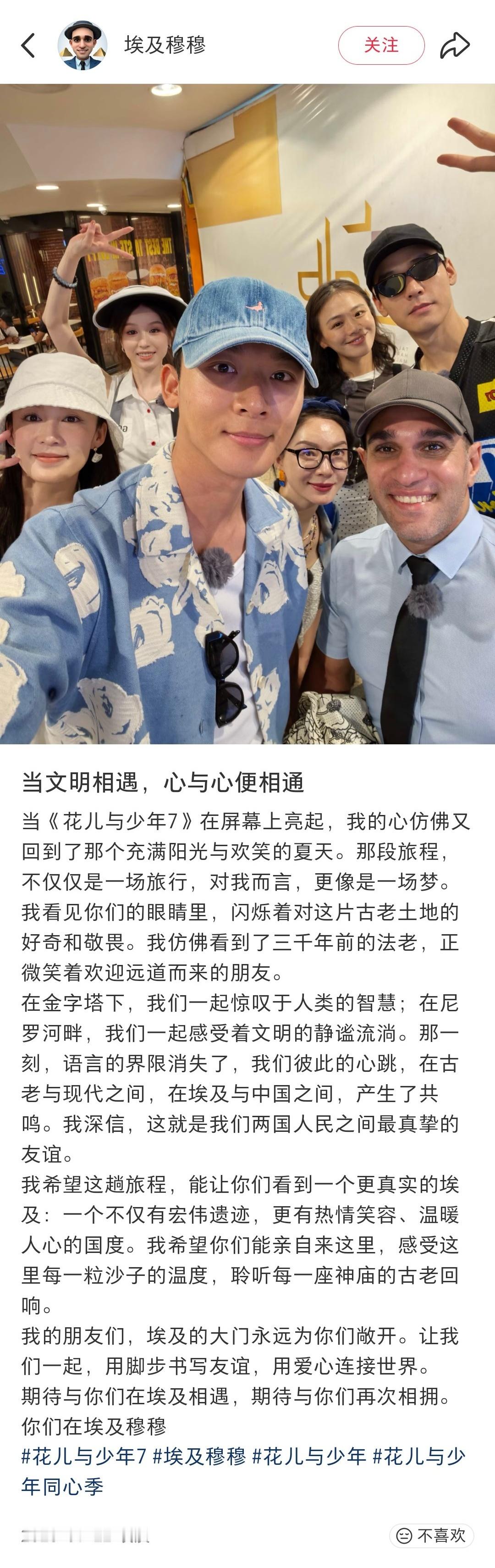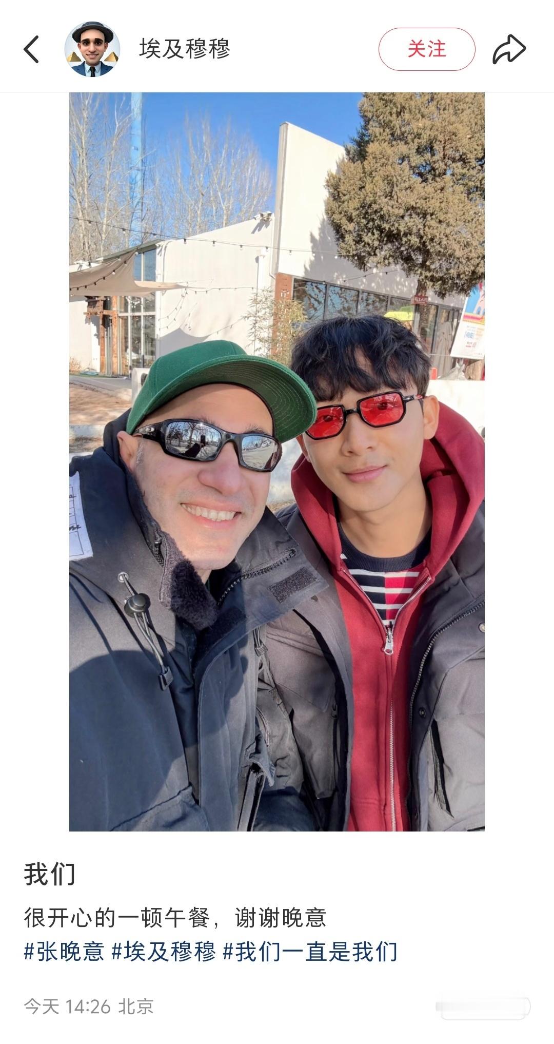 【张晚意和花少导游穆穆约上饭了】导游穆穆晒与张晚意合照 没想到花少7还有梦幻联动哎~今天,《花儿与少年·同心季》埃及站的导游穆穆来到北京,他在社交媒体晒出和的合照,“很开心的一顿午餐,谢谢晚意。”网友都在说:“感谢穆穆,要不是你来中国,我们都快20天没见到他了”