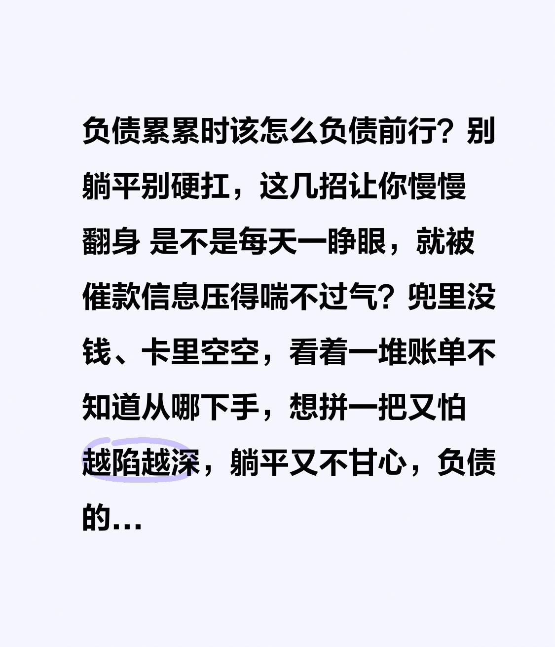 负债累累时该怎么负债前行?别躺平别硬扛,这几招让你慢慢翻身 是不是每天一睁眼,就被催款信息压得喘不过气?兜里没钱、卡里空空,看着一堆账单不知道从哪下手,想拼一把又怕越陷越深,躺平又不甘心,负债的日子到底该怎么熬?今天就把最实在的方法说透,负债不可怕,怕的是你丢了前行的勇气! 身边不少人负债后要么慌了神,拆东墙补西墙把利息越滚越高;要么破罐子破摔,每天浑浑噩噩逃避现实,最后把路走死。其实我也曾熬过这样的日子,生意失败欠了二十多万,那段时间吃不下睡不着,出门都怕碰到熟人,甚至觉得这辈子都翻不了身,直到我硬着头皮迈出第一步,才发现负债前行,拼的不是蛮力,是方法和心态。 很多人负债后都陷在一个误区:总想一口吃个胖子快速还清,结果急功近利踩了更多坑。这里藏着最关键的转折点:负债前行,不是让你硬扛所有压力,而是先学会“稳住”,再谈“翻身”。别再盯着总欠款焦虑,先把所有负债列清楚,分清本金、利息、还款日期,把高息网贷和正规欠款分开,优先还高息的,避免利滚利;和债主真诚沟通,说明情况申请延期或分期,别躲着不接电话,大多时候真诚比逃避更有用。 其次,放下所谓的面子,别觉得做小事丢人。负债的日子里,能赚钱的事就别挑,主业好好干,下班跑外卖、做兼职、摆小摊,哪怕一天只赚几十块,也是在往还款的路上走。我当时就是白天上班,晚上去夜市卖小吃,累是真的,但看着每天的收入一点点攒起来,心里就有底了。更重要的是戒掉大手大脚的习惯,戒掉无用的社交,把每一分钱都花在刀刃上,省下来的都是底气。 最难的其实是稳住心态,别因为一时的不顺就放弃。负债的路注定不好走,会有委屈、有迷茫、有不被理解,偶尔也会崩溃,但请记住,低谷期的每一步都是上坡路。别和别人比,只和昨天的自己比,今天比昨天多赚了一点,今天比昨天少焦虑了一分,就是进步。 人这一辈子,谁还没栽过几个跟头?负债只是人生的一道坎,不是终点。那些打不倒你的,终将让你更强大。负债前行的日子里,别怕慢,只怕站;别怕难,只怕逃。只要你肯脚踏实地,肯咬牙坚持,钱会慢慢还完,日子会慢慢变好,终有一天,你会熬过低谷,遇见光明。 你现在正处于负债的日子吗?有没有什么难忘的经历?评论区说说你的故事,我们互相鼓励,一起翻身!