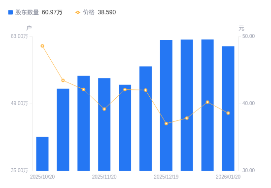 日期A股户数(户)流通A股户均持股数(股)户均持股市值(万元)2026-01-206097176605.7225.492026-01-096238516456.0625.972025-12-316235016459.6924.442025-12-196227886467.0823.952025-12-105678237092.6329.802025-11-285292617609.4032.032025-11-205432027414.1129.062025-11-105479837349.4330.952025-10-315210277729.6633.592025-10-204204679578.3046.55