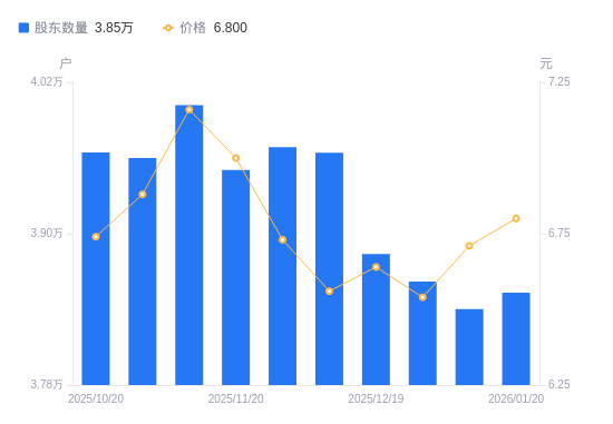 近一年(2025年1月20日至2026年1月20日),四川美丰A股股东户数从4.56万户,减低至3.85万户,降幅15.58%,区间股价下跌2.05%。