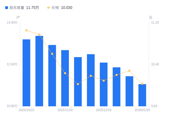 日期A股户数(户)流通A股户均持股数(股)户均持股市值(万元)2026-01-2011754330649.7230.742026-01-0912093729789.5630.622025-12-3112478628870.7029.452025-12-1912683828403.6328.662025-12-1013044327618.6528.132025-11-2812918227888.2527.962025-11-2013217927255.9227.892025-11-1013439726806.1028.432025-10-3113833426043.2028.582025-10-2013682926329.6529.10