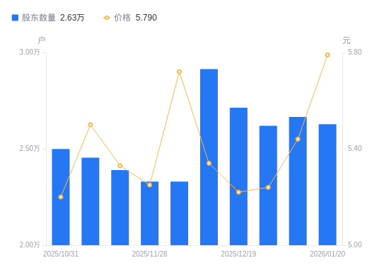 日期A股户数(户)流通A股户均持股数(股)户均持股市值(万元)2026-01-202627720966.3212.142026-01-092665420669.7711.242025-12-312619621031.1511.022025-12-192712920267.1910.582025-12-102913418872.4010.082025-12-052330023597.7913.502025-11-282330023597.7912.392025-11-202389923006.3412.262025-11-102454222403.5712.322025-10-312498722021.9911.45