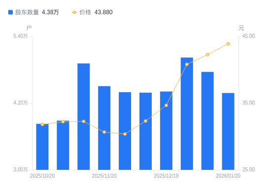 日期A股户数(户)流通A股户均持股数(股)户均持股市值(万元)2026-01-20438189667.6142.422026-01-09475988899.8537.612025-12-31501918440.0634.442025-12-19440749611.4533.312025-12-10438759655.0531.202025-11-28439649635.5029.252025-11-20450419405.1028.842025-11-10491348621.6327.812025-10-313884010906.6835.132025-10-203827011069.1235.20
