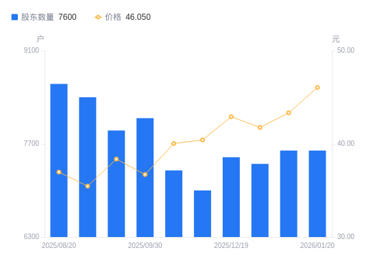 日期A股户数(户)流通A股户均持股数(股)户均持股市值(万元)2026-01-20760015690.9372.262026-01-10760015690.9367.992025-12-31740016115.0167.302025-12-19750015900.1568.232025-11-28700017035.8768.862025-10-31730016335.7765.412025-09-30808714746.0254.132025-09-19790015095.0857.922025-08-29840014196.5650.342025-08-20860013866.4151.26