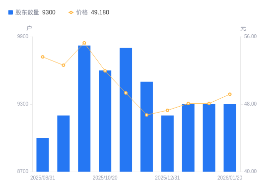 日期A股户数(户)流通A股户均持股数(股)户均持股市值(万元)2026-01-2093003986.3519.602026-01-1093003986.3519.172026-01-0993003986.3519.172025-12-3192004029.6819.052025-12-1995003902.4318.232025-10-3198003865.9619.072025-10-2096003946.5020.502025-09-3098223857.3021.322025-09-1092004118.0921.672025-08-3190004209.6022.57