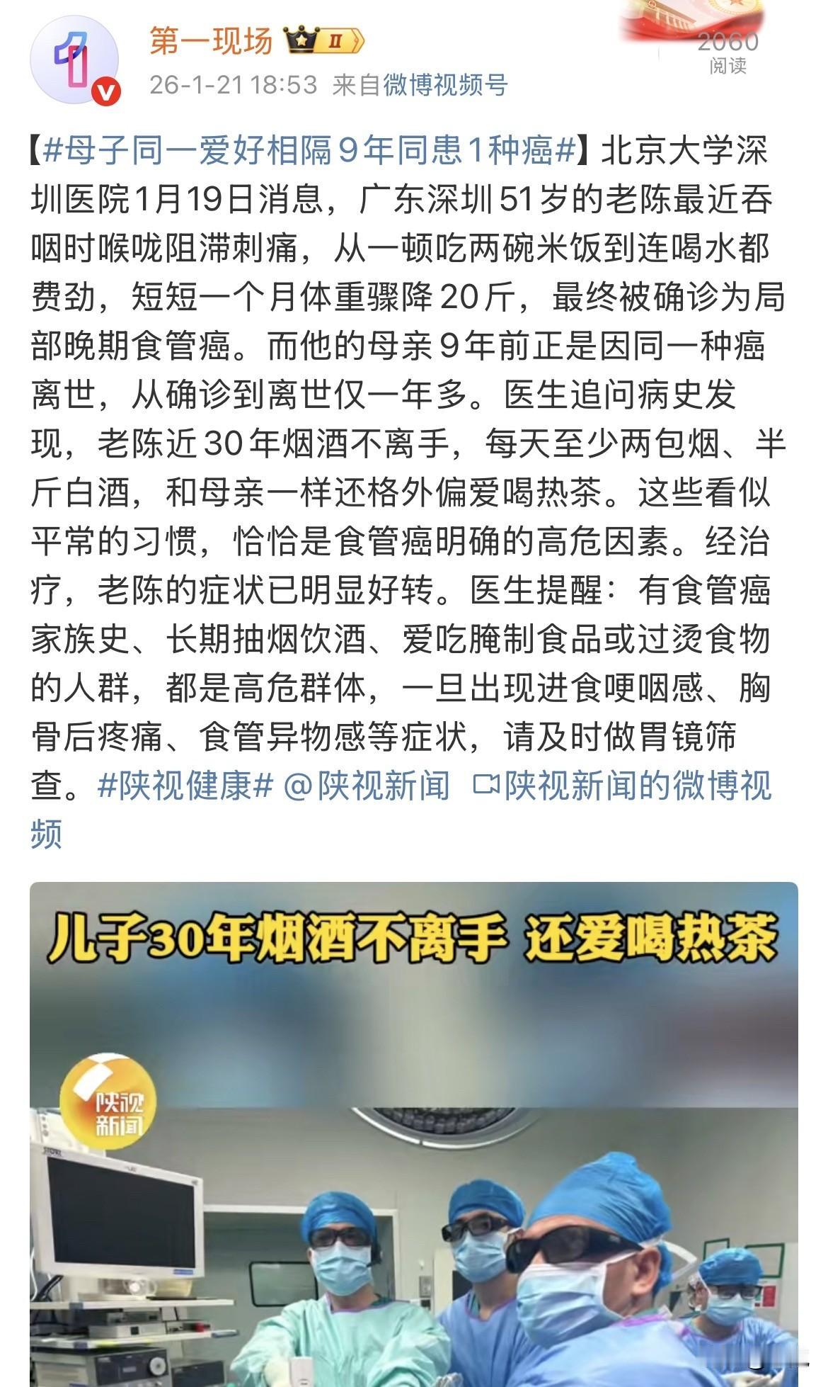 深圳的老陈,在确诊为局部晚期食管癌的那一刻,脑海里闪过的,是9年前母亲被同一种病带走的画面。从确诊到离开,不过一年多。同样的路,他似乎又要走一遍。 医生追问他的生活。近30年,烟酒不离手。每天至少两包烟,半斤白酒。还有,和他母亲一样,格外偏爱那一口滚烫的热茶。 这些他习以为常,甚至带着点“享受”意味的习惯,被医生点破——都是食管癌明确的高危因素。 热茶烫过的食管,酒精刺激过的黏膜,烟雾熏燎过的细胞。日复一日,年复一年,在看不见的地方,一场背叛早已悄然发生。 这不是命运的偶然捉弄,更像是一场由自己和生活习惯共同写就的剧本。母亲的角色演完了,现在轮到了他。 经过治疗,老陈的症状好转了。但这个故事留下的凉意,比任何说教都深。 这不是孤例。有数据显示,食管癌有明显的家族聚集现象。除了遗传因素,共同的生活环境和饮食习惯,比如共享一壶滚烫的茶,一桌高盐的腌制菜,往往是更关键的推手。 烟、酒、烫,被列为食管癌的“三兄弟”。国际癌症研究机构早已将超过65℃的热饮列为2A类致癌物。那种“趁热喝”的关怀,可能正变成一种伤害。 有食管癌家族史的人,长期抽烟饮酒的人,爱吃腌菜或过烫食物的人,都被划为高危群体。 身体的警报,有时候很微弱。如果出现吞咽有哽咽感、胸骨后疼痛、感觉食管里有东西咽不下去,别简单地当成“上火”或“咽炎”。 对高危人群来说,一次及时的胃镜筛查,可能就是生与死的分界线。 老陈和母亲的故事,像一面残酷的镜子。照见的,是那些我们深信不疑的生活“滋味”,可能暗藏的风险。 健康的选择,往往不是在做与不做之间,而是在知道与不知道之间。当你知道喝下去的那一口有多烫,点起的那根烟意味着什么,手里的酒杯有多重,选择才会真正开始。 读者热议: “看完一身冷汗,我爸就天天喝滚烫的功夫茶,说了也不听,这下有实实在在的例子给他看了。” “其实很多病都是这样,一家人生活习惯差不多,得一样的病真不全是遗传。” “胃镜真的没那么可怕,尤其是无痛的。我去年就是吞咽不舒服去做的,幸好只是炎症。这种检查不能拖。” “烟酒烫,全占了……是该好好反思一下了。有时候就是抱着侥幸心理。” 你怎么看?你身边有类似“一家人相似习惯”的情况吗?得同一种病是遗传还是生活习惯相同?