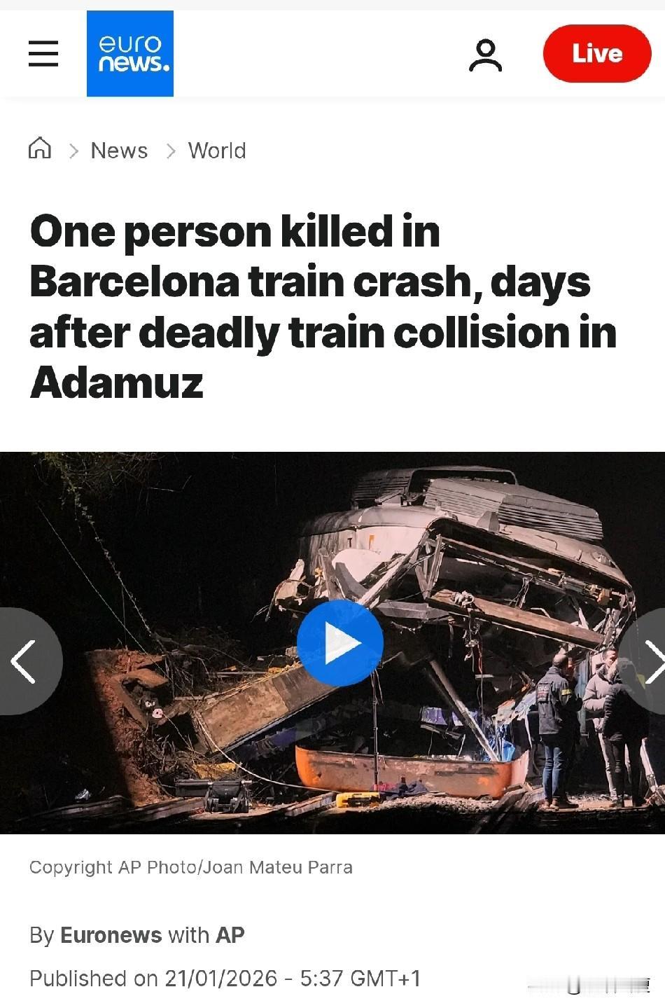 西班牙又发生两起脱轨事件!或许事不过三? 西班牙国王夫妇刚从第一起现场回来: 1. 隔了两天的巴塞罗那发生了一起火车脱轨,一名司机死亡,40人受伤住院。这次原因不是铁轨断裂,而是由于持续强降雨,附近高速公路的一处挡土墙坍塌,导致该列车脱轨。 2. 几乎同时在加泰罗尼亚,另一列火车也发生脱轨事故,所幸未造成人员伤亡。 这都不是犯太岁的程度了。
