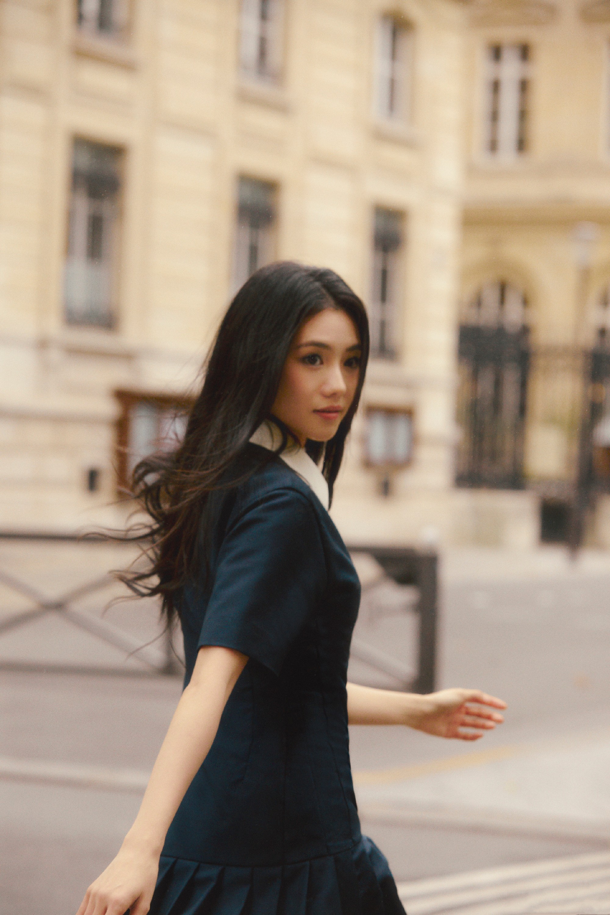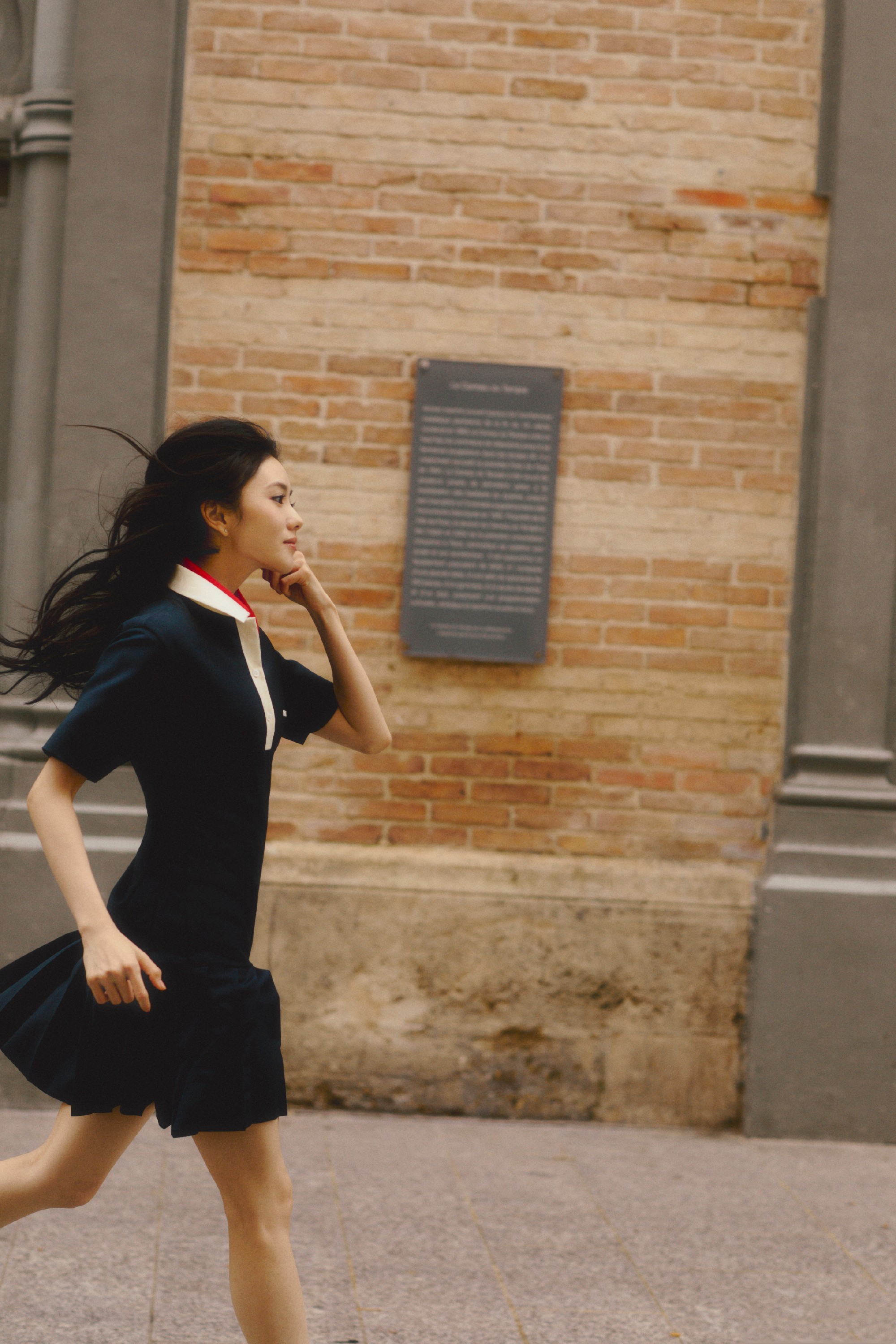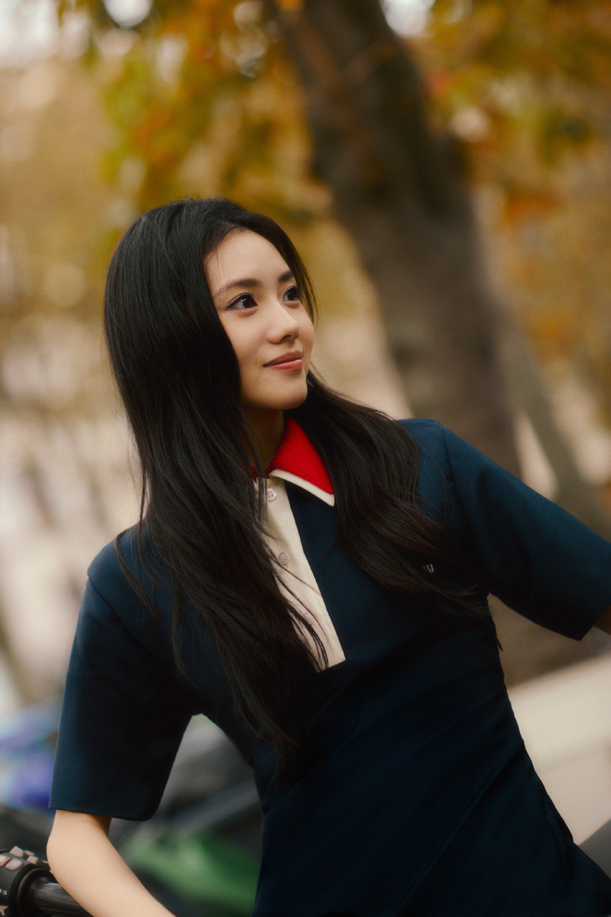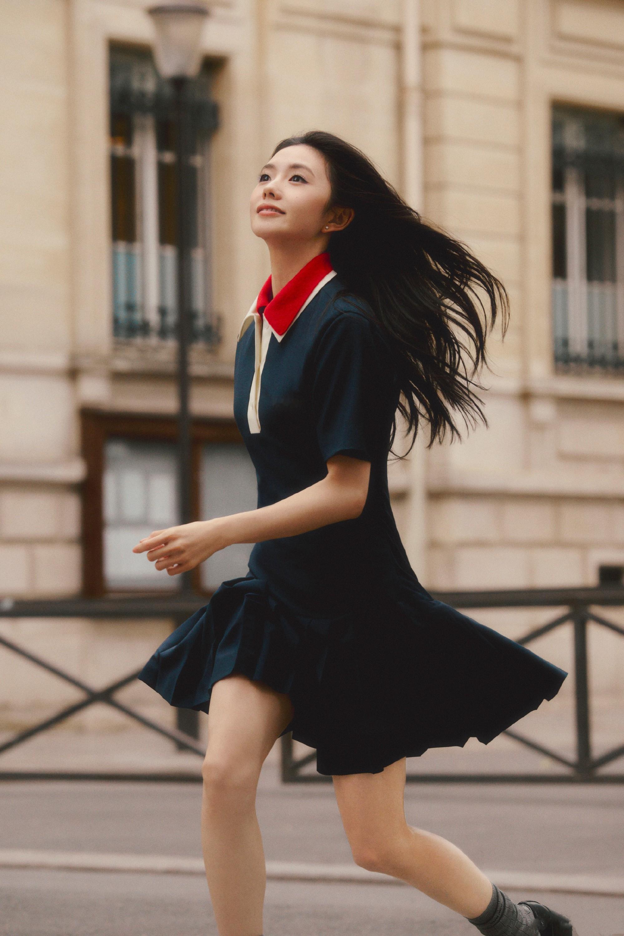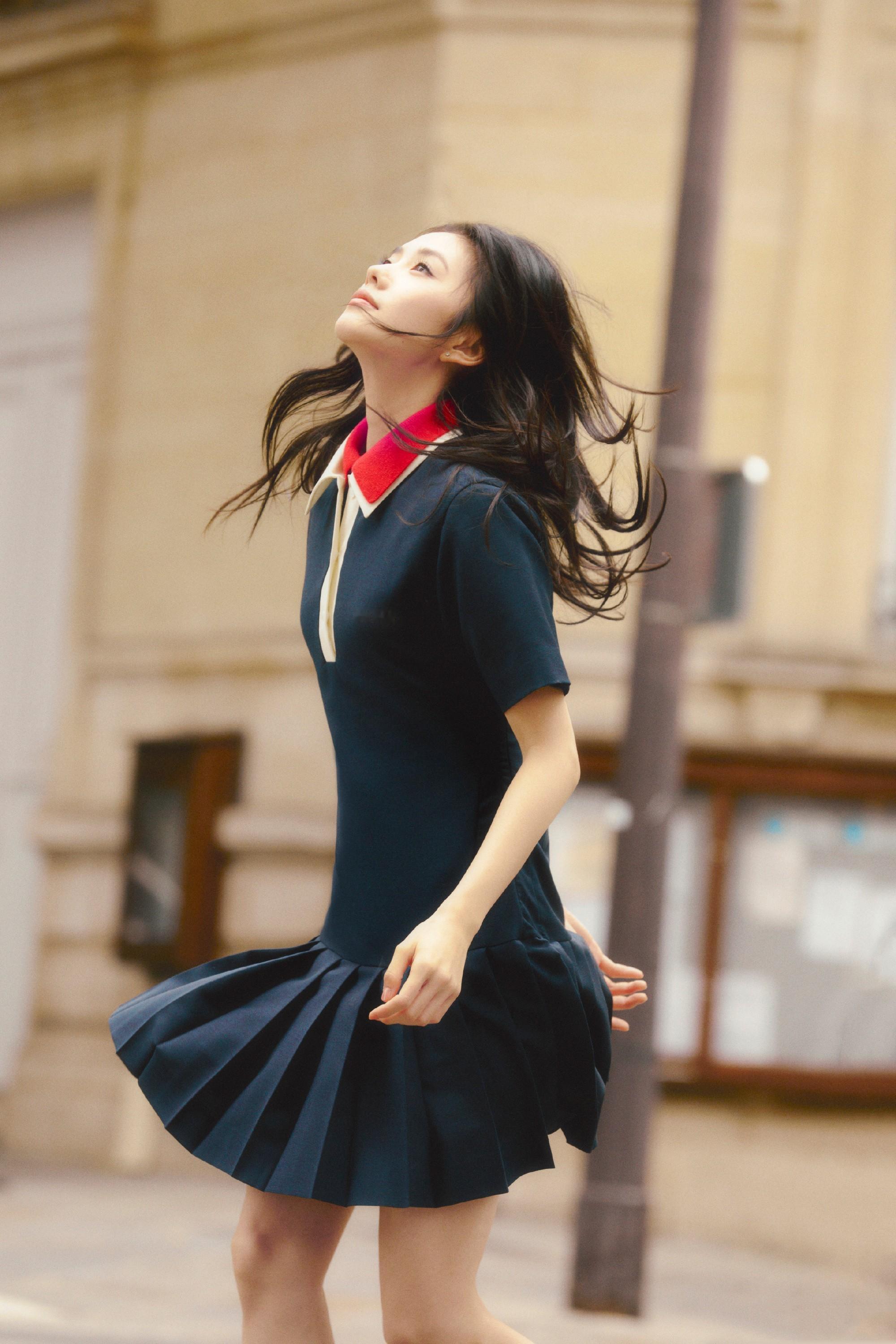 刘浩存甜美街拍:穿墨色连衣裙的“女高学姐”。刘浩存