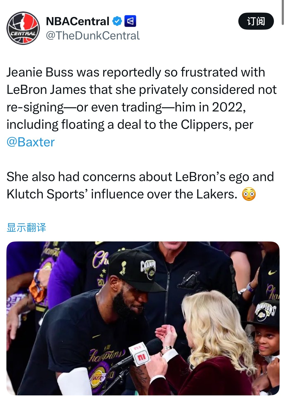 据报道,珍妮·巴斯曾对詹姆斯非常失望,以至于在 2022 年私下考虑过不与他续约,甚至考虑将他交易出去,其中还曾向快船方面抛出过交易方案。她还担心勒布朗的自我意识过强,以及富保罗的经纪公司对湖人队的影响。珍妮·巴斯表示:“私下里,我曾考虑过不和他续约,甚至把他交易出去。感觉勒布朗并不感激湖人队选中了布朗尼。出于对公关形象受损的担忧,勉强同意与他续约。”洛杉矶湖人