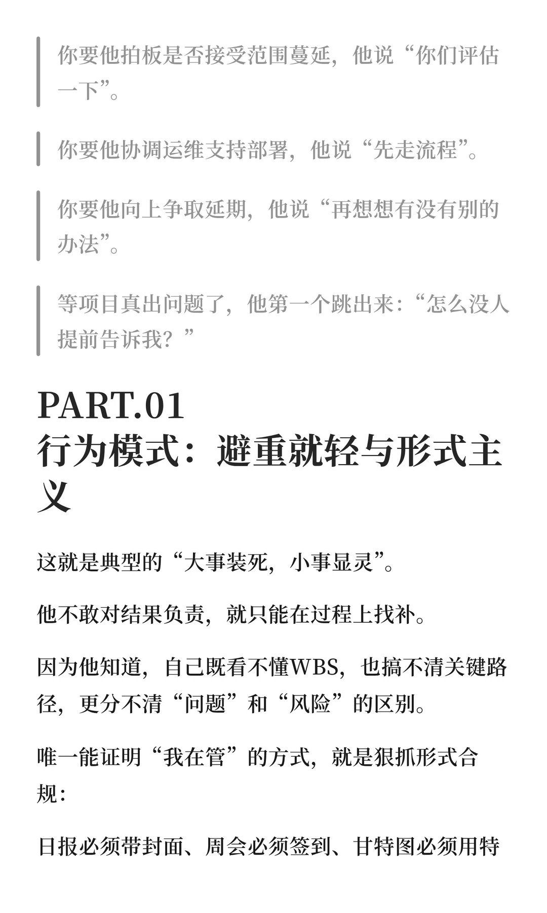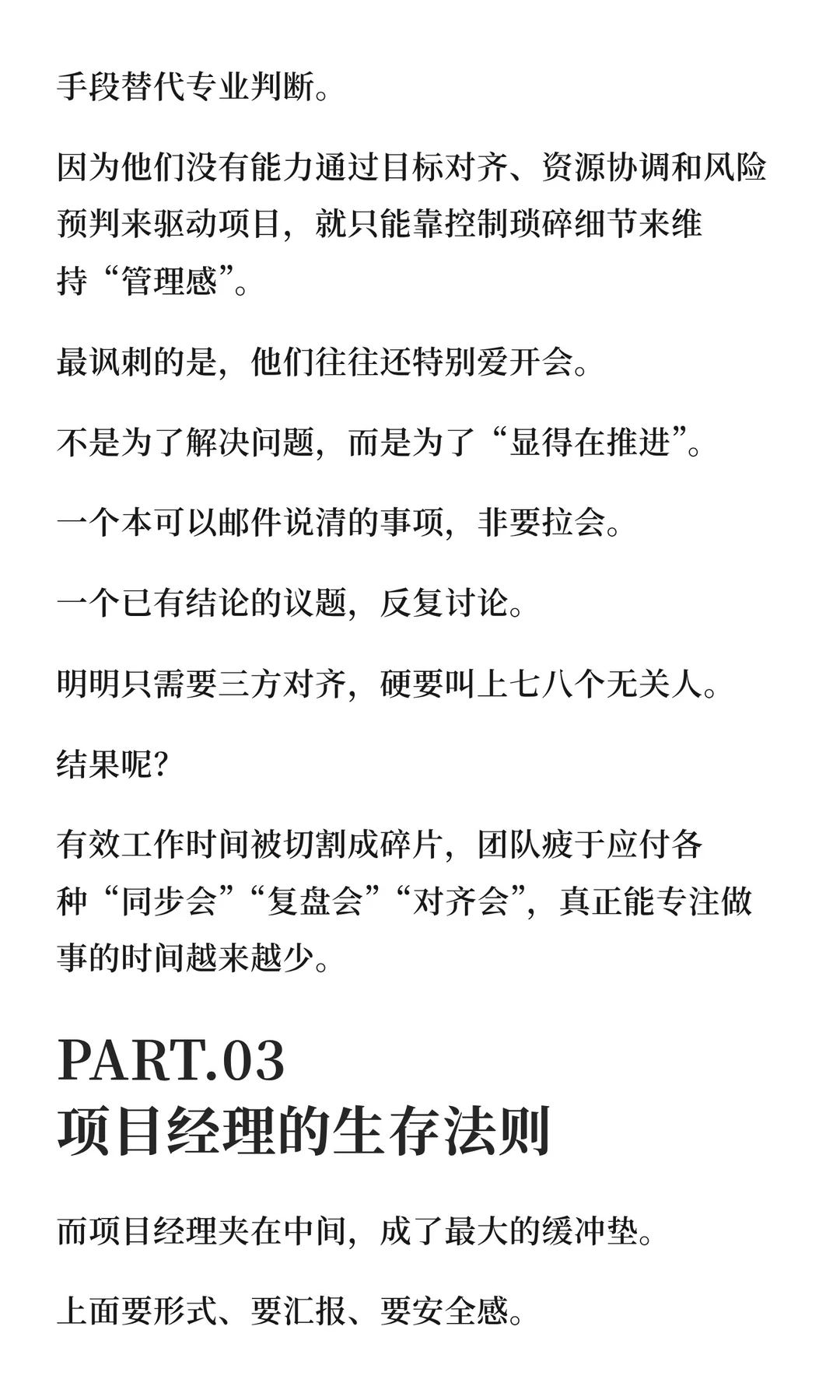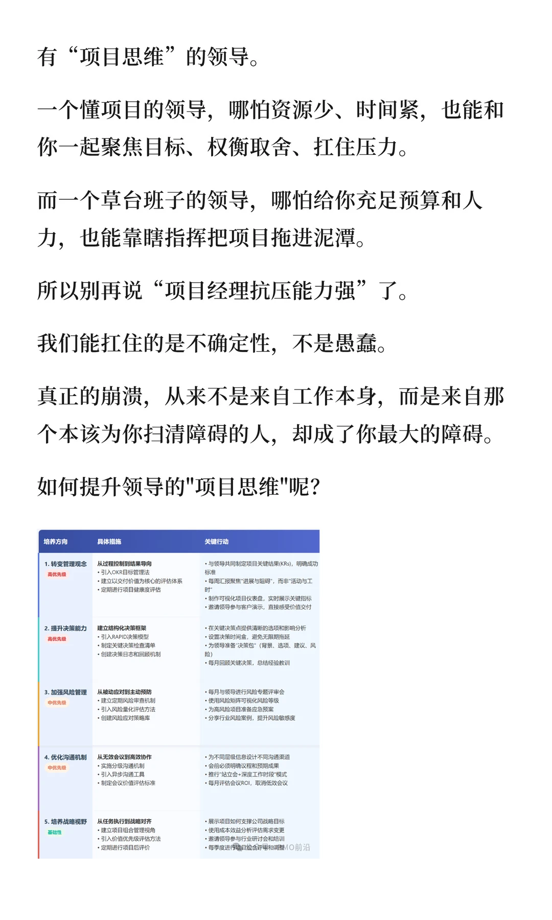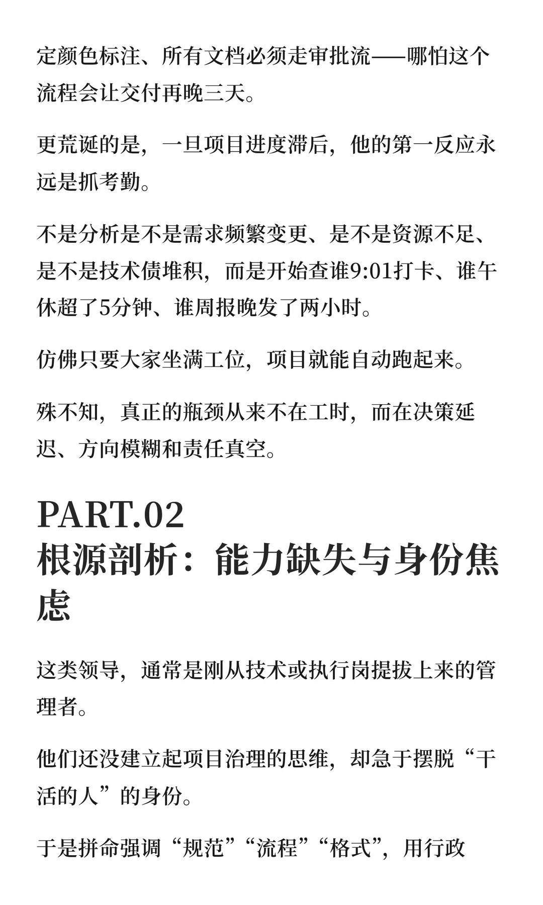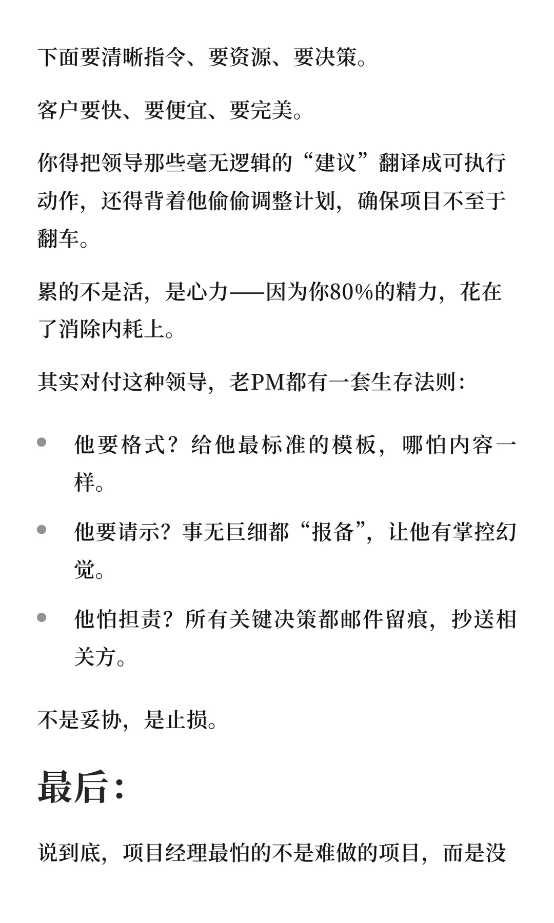 让项目经理崩溃的从来不是工作量和压力,而是草台班子领导。 越没水平的领导越爱扣细节,鸡毛蒜皮的事翻来覆去说,大事定不了,小事瞎指挥。 你遇到过什么样的奇葩领导呢