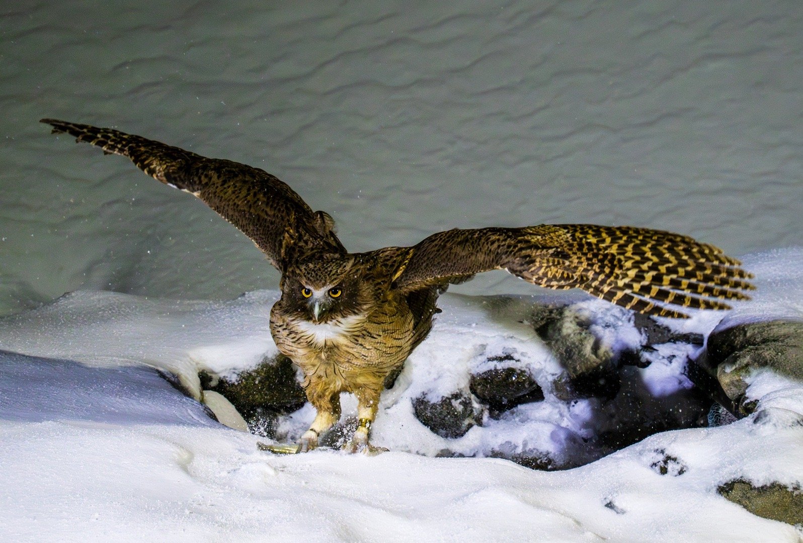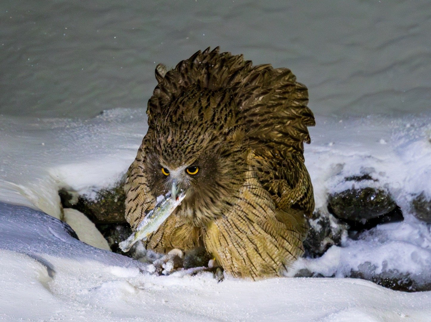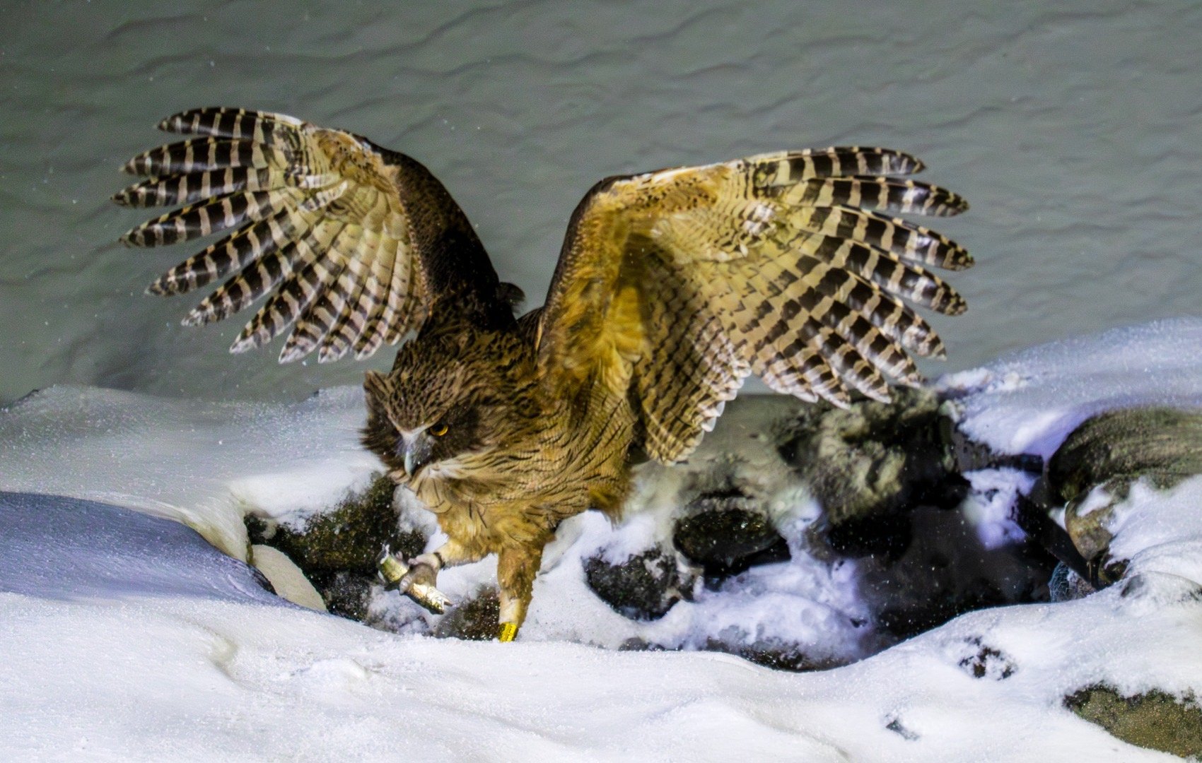 北海道毛腿渔鸮,世界最大猫头鹰之一,IUCN濒危物种,极少在野外遇到。体长近80cm,翼展2米,体重超4kg。今晚我们守候2个多小时,拍到它在雪中捕鱼全过程,明天晚上继续拍。