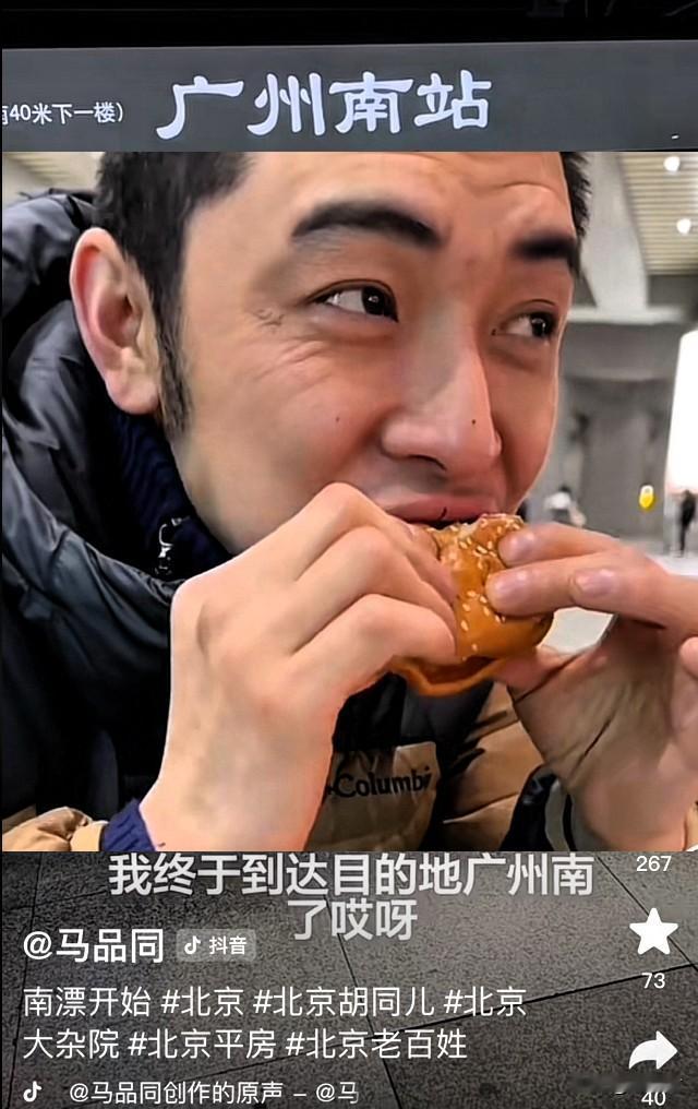 马品同晒“十指相扣”,神秘女友未露面 马品同,以“北京二环里胡同居民”的标签走红网络,他从直播居家生活开始,火了之后又做起了带货博主。 最近,马品同又有了新剧情。 四十多岁的马品同离过一次婚,前妻是山西人,两人之间没有生孩子。 马品同告诉大家,他已经乘坐火车从北京到达了广州,马品同跨越千里从北到南为哪般? 原来,马品同开直播以后,与一位女子通过网络结缘,他此行的目的是为爱奔现 在北京临出门前,马品同的父母依依不舍跟着送行,直到司机将出租车启动。 北京到广州,坐高铁朝发夕至,用时大约7-10个小时不等,高铁单程票价800-1000元以上。 视频中出现了广州南站,或许是在火车上没有吃饭的缘故,马品同蹲在地上大口大口的吃着手中的汉堡,感觉他好像饿坏了。 视频中女主角始终没有露面,只是偶尔传出过几句女声在搭腔,听口音不像广东腔调。 马品同当然知道大家想看什么,他放出了两次和一个女人十指相扣的镜头。 一次是在火车站,一次是在暮色中行驶的出租车里。