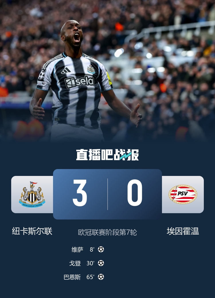 直播吧1月22日讯北京时间4:00,欧冠联赛阶段第7轮纽卡斯尔联vs埃因霍温,比赛在圣詹姆斯公园球场打响!上半场,维萨破门帮助纽卡取得领先!随后维萨又前场抢断,助攻戈登再下一城!下半场,巴恩斯再下一城。最终,纽卡3-0完胜埃因霍温。