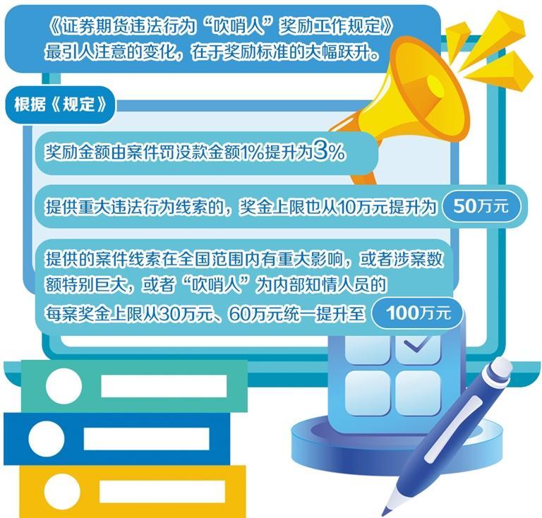近日,证监会、财政部修订发布《证券期货违法行为“吹哨人”奖励工作规定》(以下简称《规定》),进一步完善举报制度,有效回应市场关切,弘扬公正担当的“吹哨人”文化,更好适应资本市场高质量发展和监管执法工作要求。