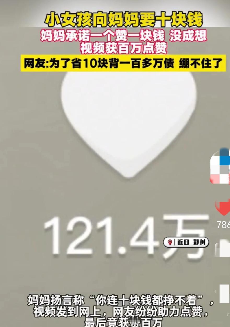 10元零花钱,竟让妈妈“负债”百万? 河南郑州的吴女士,一句玩笑话差点“倾家荡产”!女儿要10元买文具,她随口抛出“神操作”:“拍视频发抖音,一个赞给一块钱!”本以为自家账号点赞不过百,谁知网友太“给力”,3天点赞破123万!吴女士瞬间从“省钱妈妈”变“百万负翁”,账号名火速改成“欠女儿102万努力还”。 更硬核的是,她没删视频跑路,反而拉着女儿拍“还债vlog”:先兑现一摞现金让孩子乐开花,再承诺分期还款,甚至放话“大不了把房子抵给女儿”。网友调侃:“这是史上最贵的10元教育基金!” 可别光顾着笑。吴女士的“较真”,恰恰戳中了家庭教育的痛点:父母的承诺,对孩子而言就是“法律”。随口的一句戏言,在流量放大镜下可能变成“信用危机”。她用百万代价教会孩子——承诺一旦出口,就要用行动兑现。 比起那些骗孩子“下次买”却转头就忘的家长,吴女士的“负债”,其实是给孩子存下的最贵“诚信存款”。毕竟,比金钱更珍贵的,是让孩子相信:这个世界,言而有信的人,永远不会破产。
