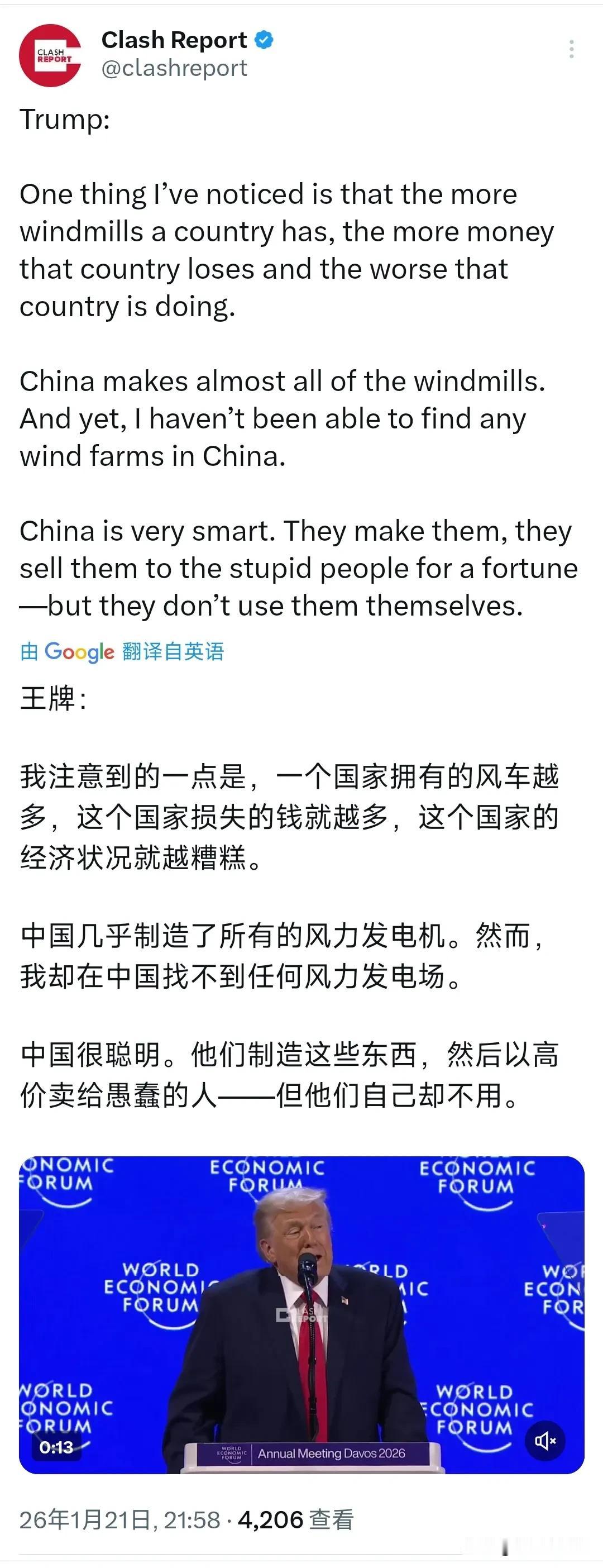 特朗普刚刚在达沃斯论坛上又胡说八道了。特朗普表示:“我注意到的一点是,一个国家拥有的风车越多,这个国家损失的钱就越多,这个国家的经济状况就越糟糕。中国几乎制造了所有的风力发电机。然而,我却在中国找不到任何风力发电场。中国很聪明。他们制造这些东西,然后以高价卖给愚蠢的人但他们自己却不用。” 评几句 特朗普在达沃斯论坛上的这番言论再次暴露了他对可再生能源和全球能源格局的深刻误解,以及他为了政治目的不惜歪曲事实的惯常做法。 从事实层面看,特朗普的陈述完全站不住脚。中国不仅是全球最大的风力发电机制造国,更是全球最大的风力发电市场。截至2025年底,中国风电装机容量已超过4.5亿千瓦,占全球总量的40%以上。从新疆的戈壁到内蒙古的草原,从江苏沿海到西藏高原,中国遍布着数以万计的风力发电场。特朗普声称"在中国找不到任何风力发电场",这种睁着眼睛说瞎话的行为,已经不是第一次了。 他的逻辑荒谬至极。将风车数量与国家经济状况简单挂钩,完全无视了各国在能源转型、环境保护和可持续发展方面的战略考量。丹麦作为全球风电比例最高的国家之一,其经济发展水平和社会福利制度举世公认;德国通过发展风电等清洁能源,不仅降低了能源对外依存度,还培育了具有国际竞争力的绿色产业链。这些成功案例都证明,风电发展与经济繁荣并非对立关系。 特朗普此举反映了他对全球能源转型大势的恐慌和抗拒。在气候变化日益严峻的背景下,发展清洁能源已成为全球共识。特朗普固守化石能源利益,不仅违背了历史潮流,也损害了美国自身的长远利益。他所谓的"中国聪明论",实际上是在为美国在新能源领域的落后找借口,试图通过贬低他国来掩盖自身的政策失败。 这种"反智"言论的危害不容小觑。它不仅误导公众对可再生能源的认知,还可能影响相关政策的制定和实施。在全球面临气候危机的当下,我们需要的是理性对话和务实合作,而不是为了政治私利而散播种族主义和反科学论调。 特朗普的这些言论,说到底不过是他"美国优先"极端思维的延续,是他为了迎合特定选民群体而不惜牺牲事实和理性的又一例证。