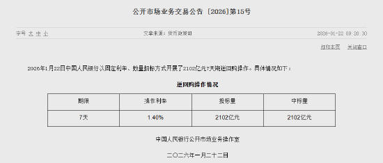 1月22日金融一线消息,央行今日开展2102亿元7天逆回购操作,投标量2102亿元,中标量2102亿元,操作利率为1.40%,与此前持平。